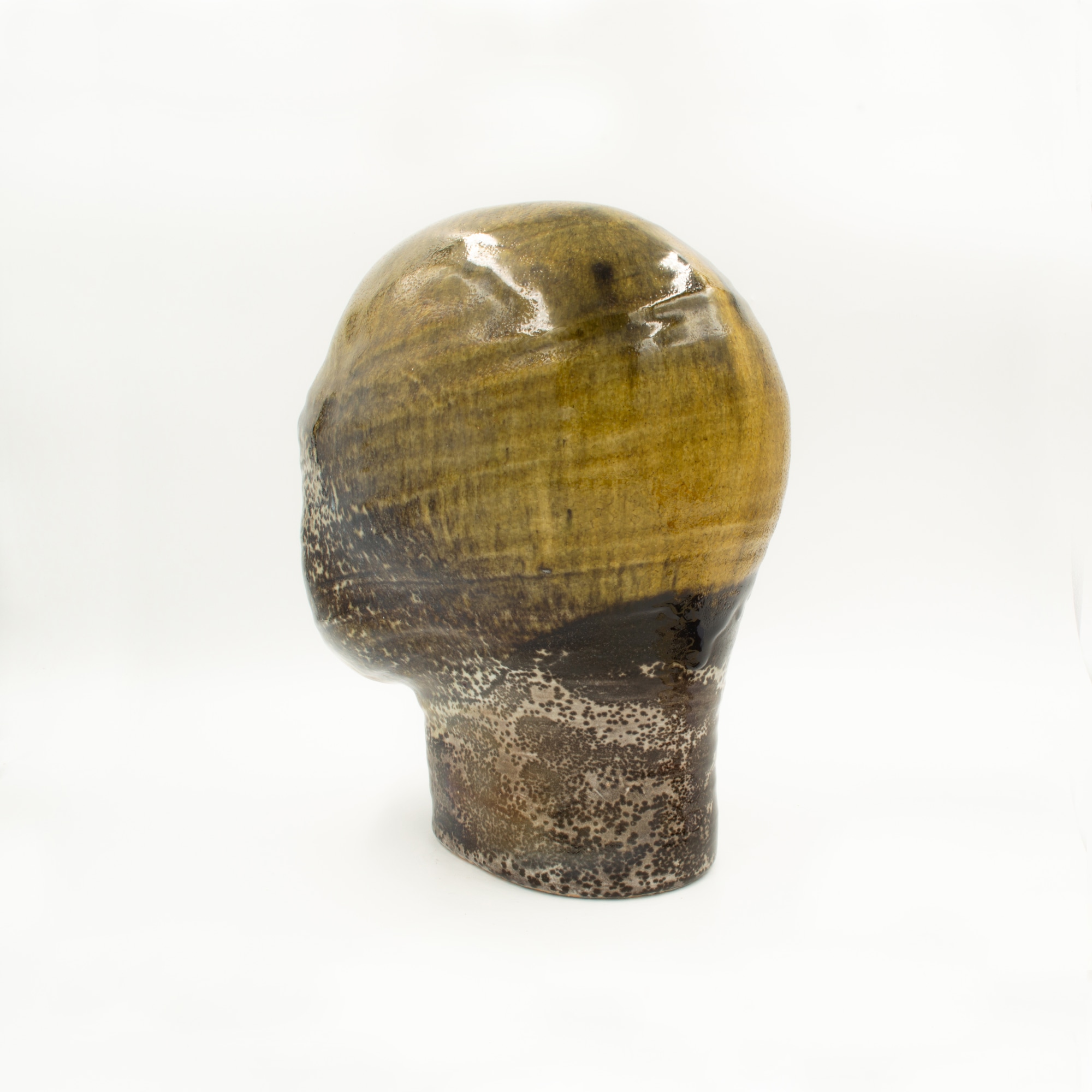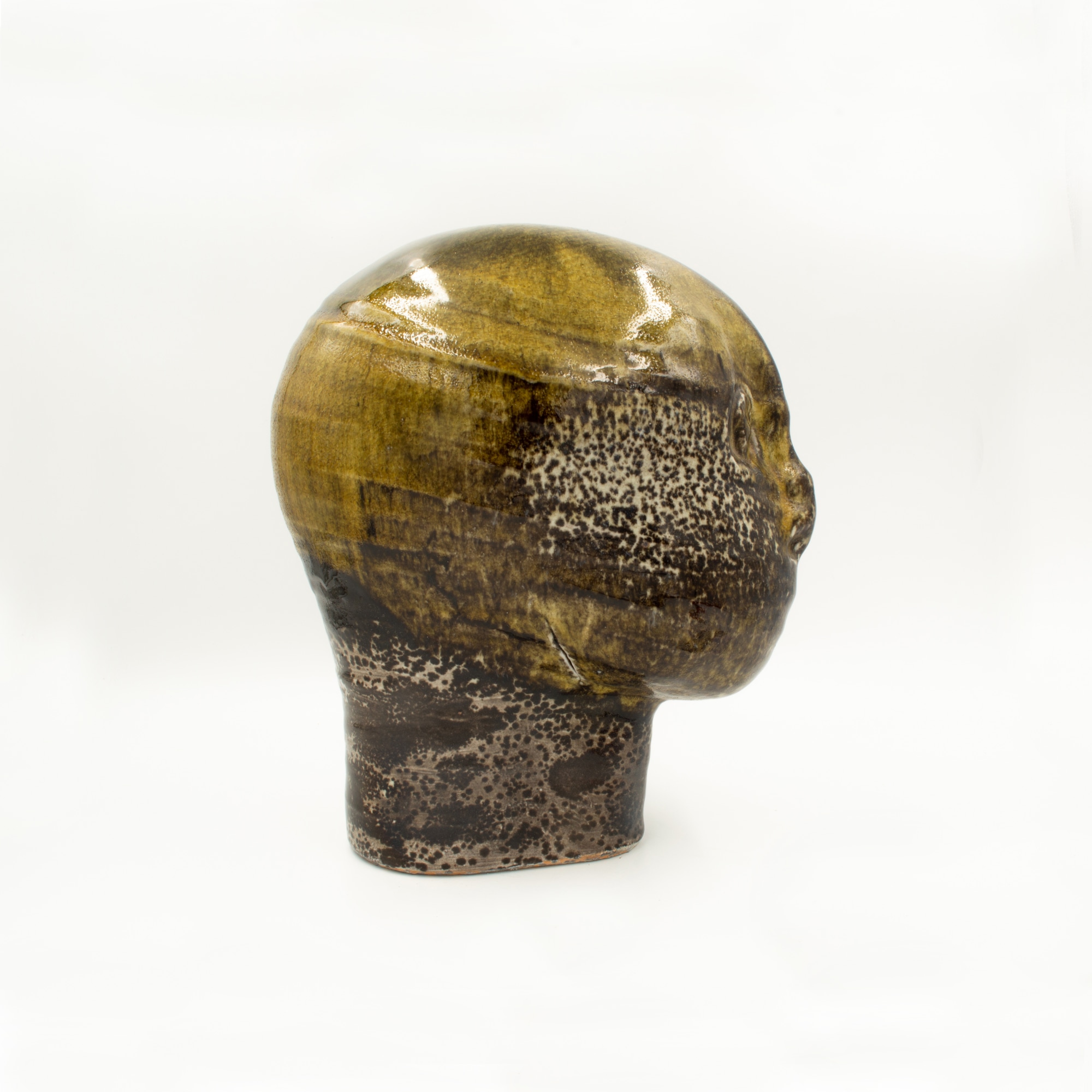 Mary Bowron is a ceramic artist from Boyds, Maryland. Her body of work, primarily heads, is part of the Silent Witness Series that Bowron produced over many years. Each piece is approximately 10 inches tall and they were created by a variety of clays and glazes. Having grown up in the south during a time of racial tension and unease, the heads reflect Mary’s passion for human rights and equality. In speaking of the heads, Mary has said, “all have no mouth for fear of speaking what they say and hear. This fear is a plague on us all.” She also refers to the heads as a “crowd of silence and fear.”