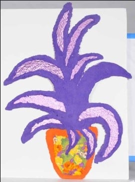 Item Description: Purple plant with pink foil-like center in leaves nested in an orange pot with green, yellow, purple, and orange floral pattern.
