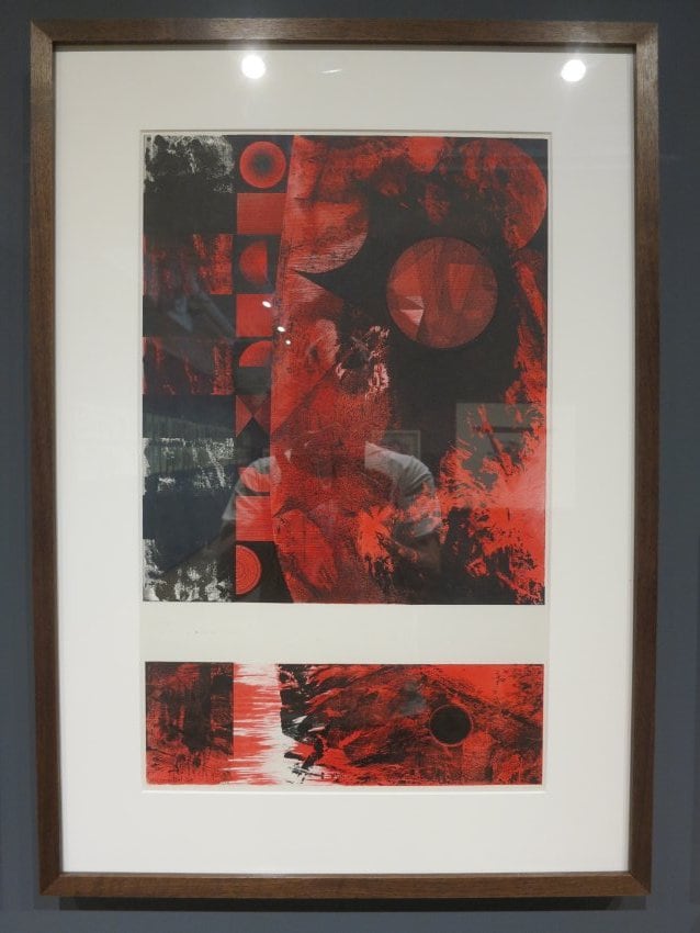 Item description: Abstract, red and black, circles and squares, two part print on one vertical piece of paper.