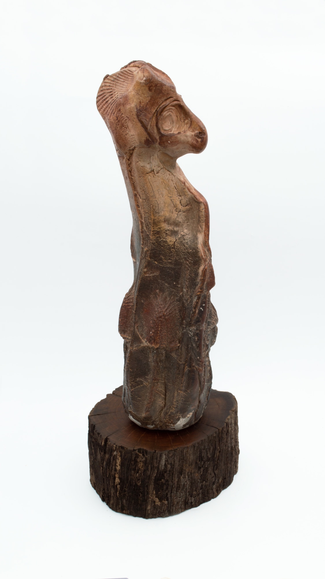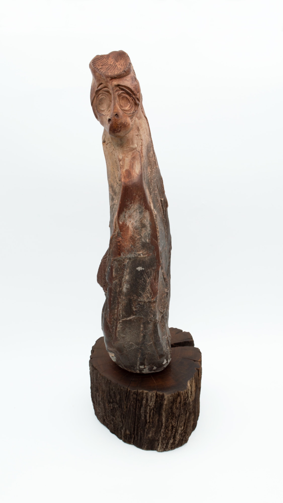 Item description: Waxed wood fired ceramic figure on a wooden base.