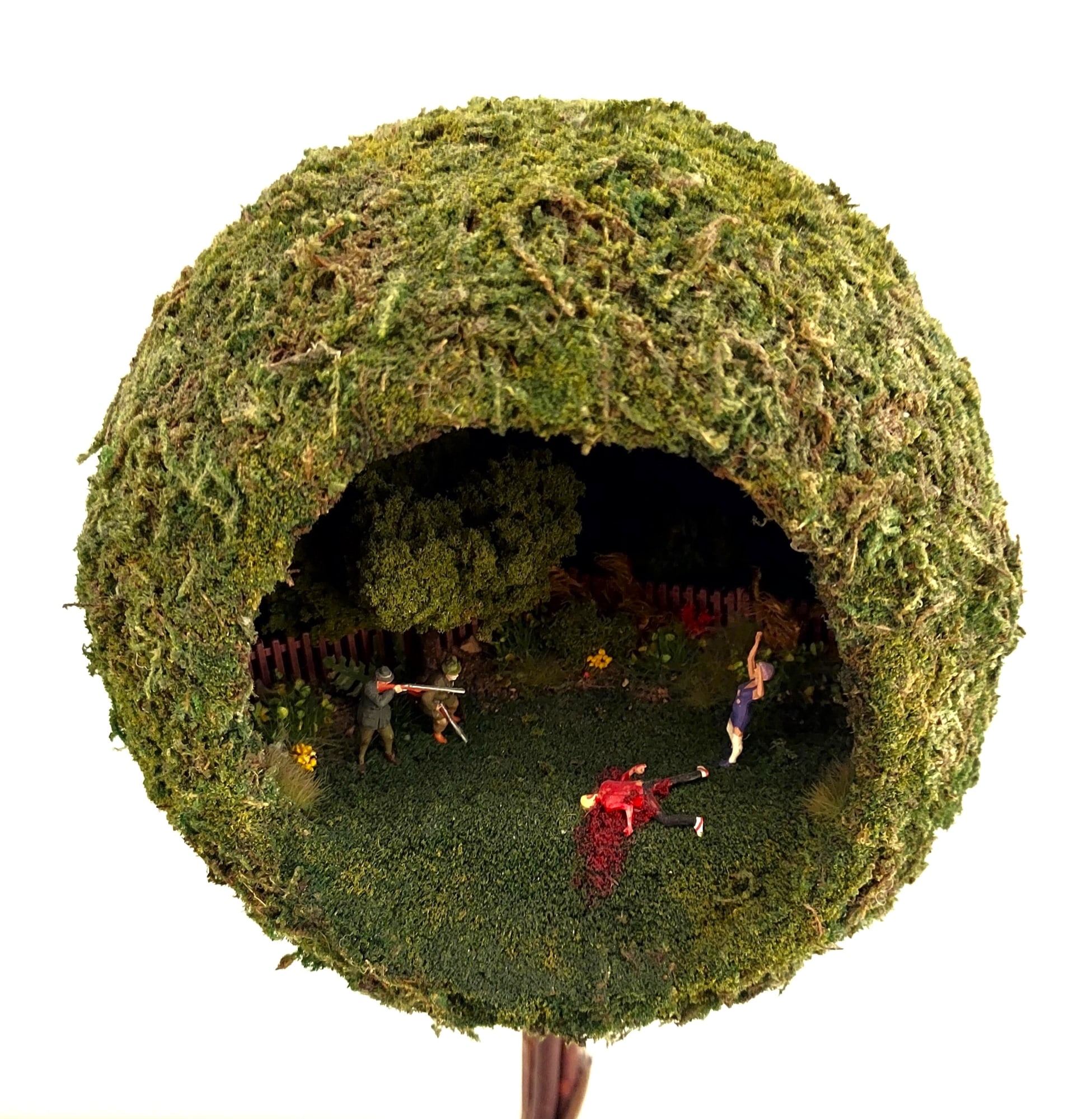 Item description: A topiary tree sculpture depicting a soldier, a corpse, and someone with their hands up. Abigail Goldman’s “Die-o-Ramas” are dioramic vignettes explore society’s cavalier attitude toward extreme gore, sex, and violence.