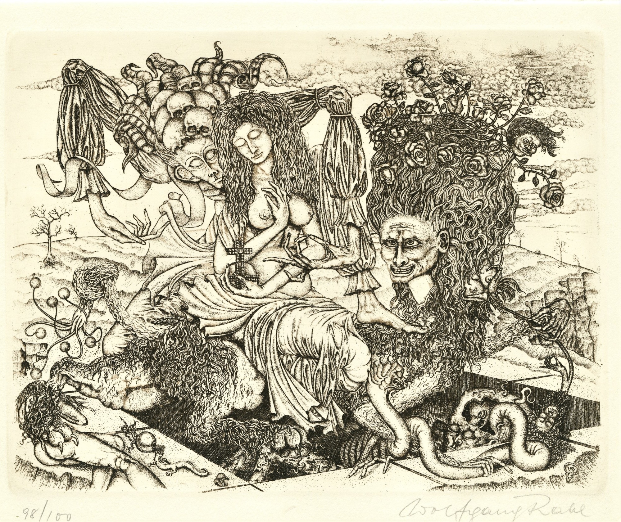 Item description: Nude woman resembling the Virgin Mary (holding orb with cross) suspended over square pit. To the right is a figure with wild and large hair with roses growing out of the top.