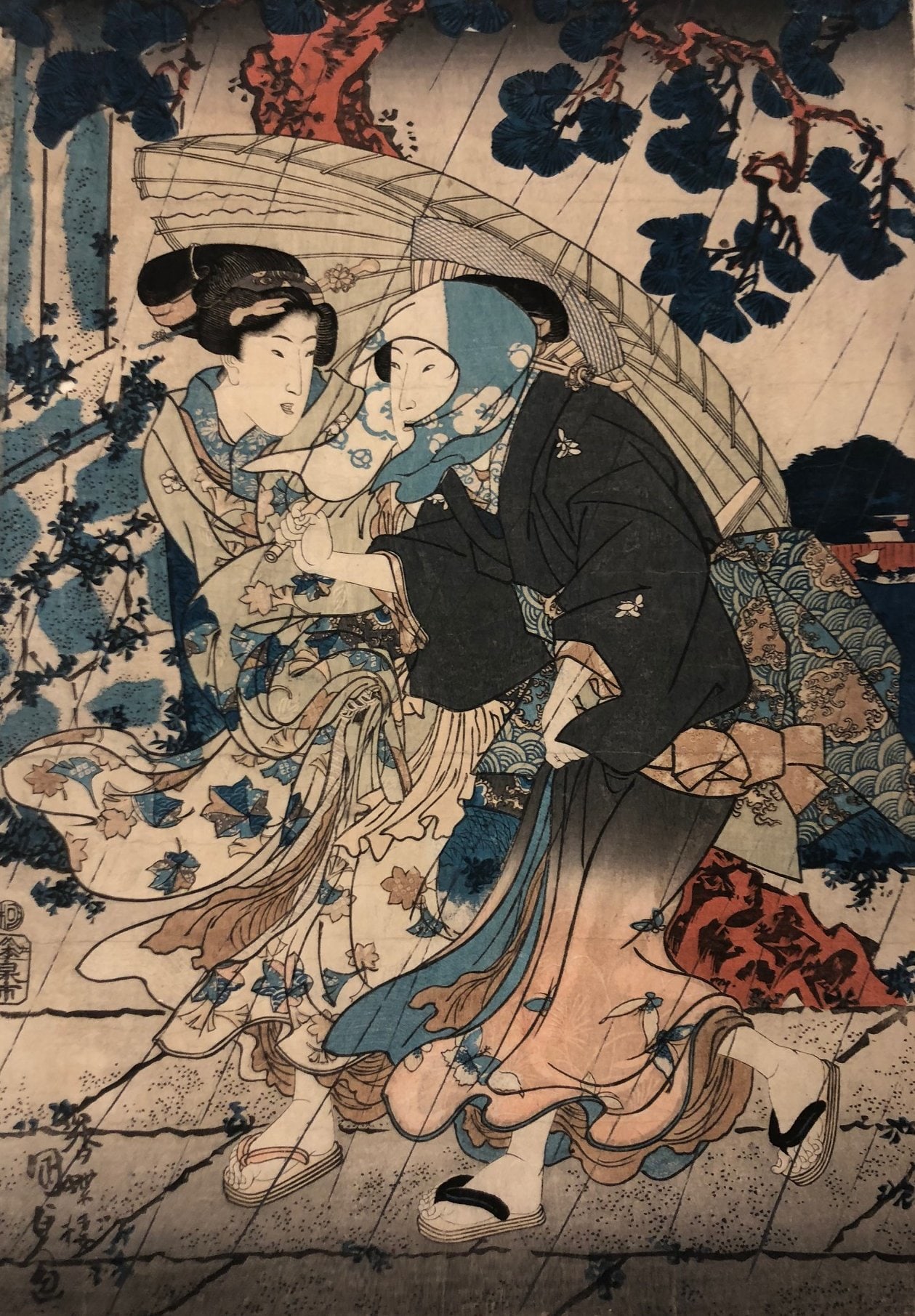 Two women caught in a storm. One holds the umbrella while the other crouches below it. The wind pulls their clothing forward, which appears to the left on the canvas. Thin lines of rain come from the sky past the figures to the ground.