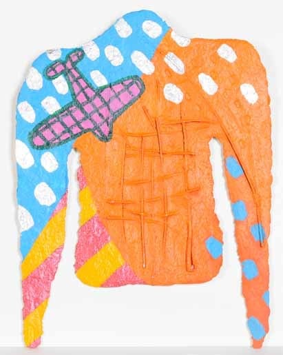 Item Description: Blue, orange and striped torso form with hunter green outlined airplane containing pink uniform squares with white dots on blue and orange background, blue dots on orange background, and yellow and pink stripes. Also parallel and perpendicular line-like indents in "abdominal" area of torso form.