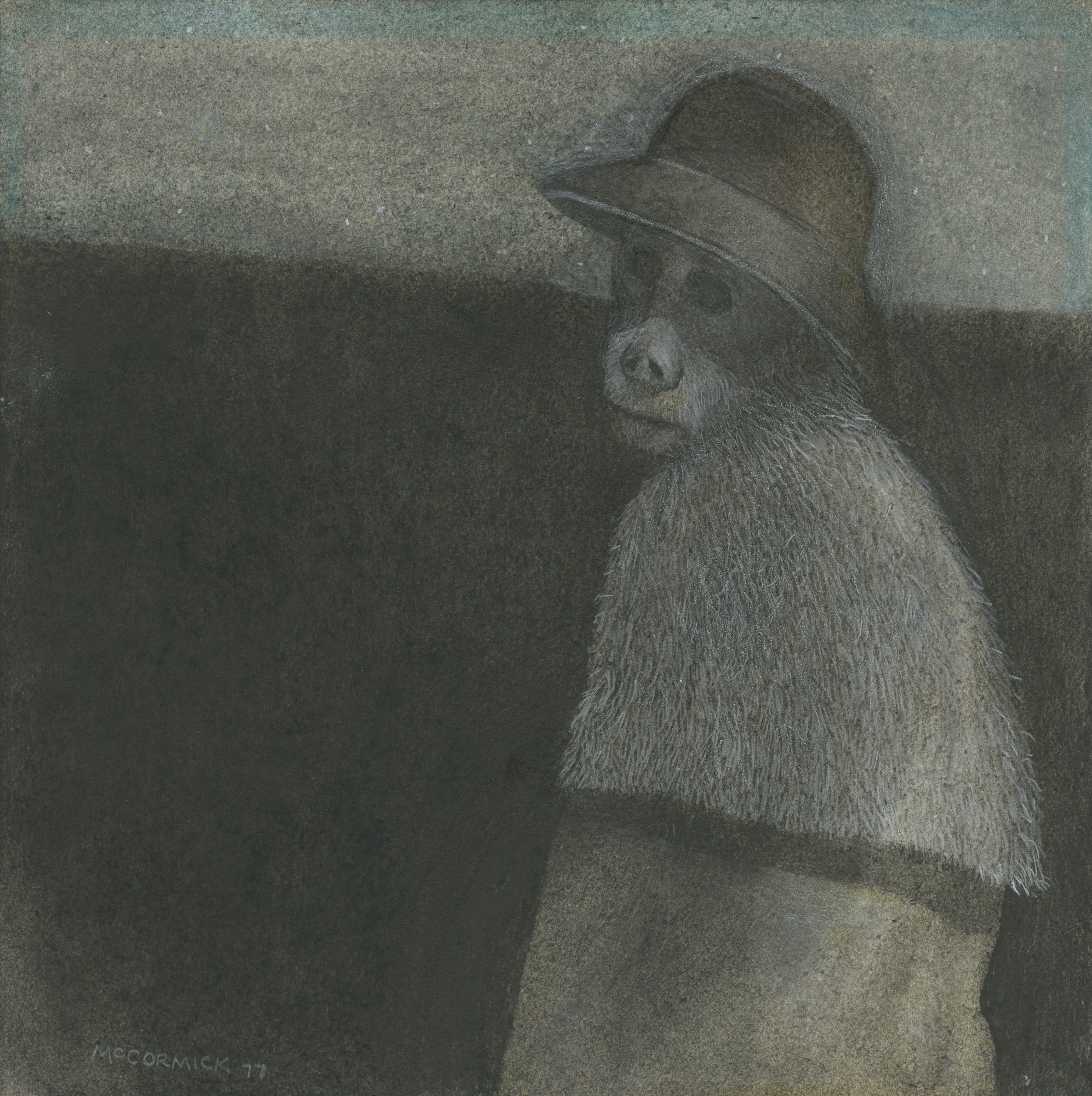 Item description: A Monkey wearing a hat looking over it's left shoulder, black background with horizon line.