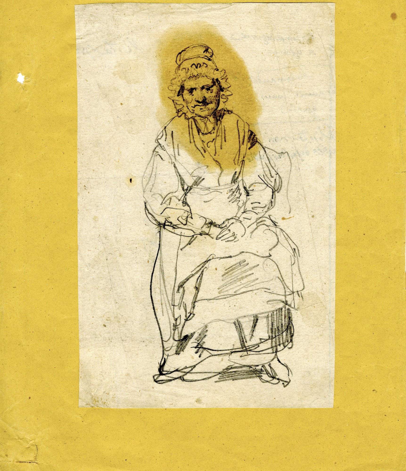 Older woman sitting wearing a bonnet and apron with a dress underneath.