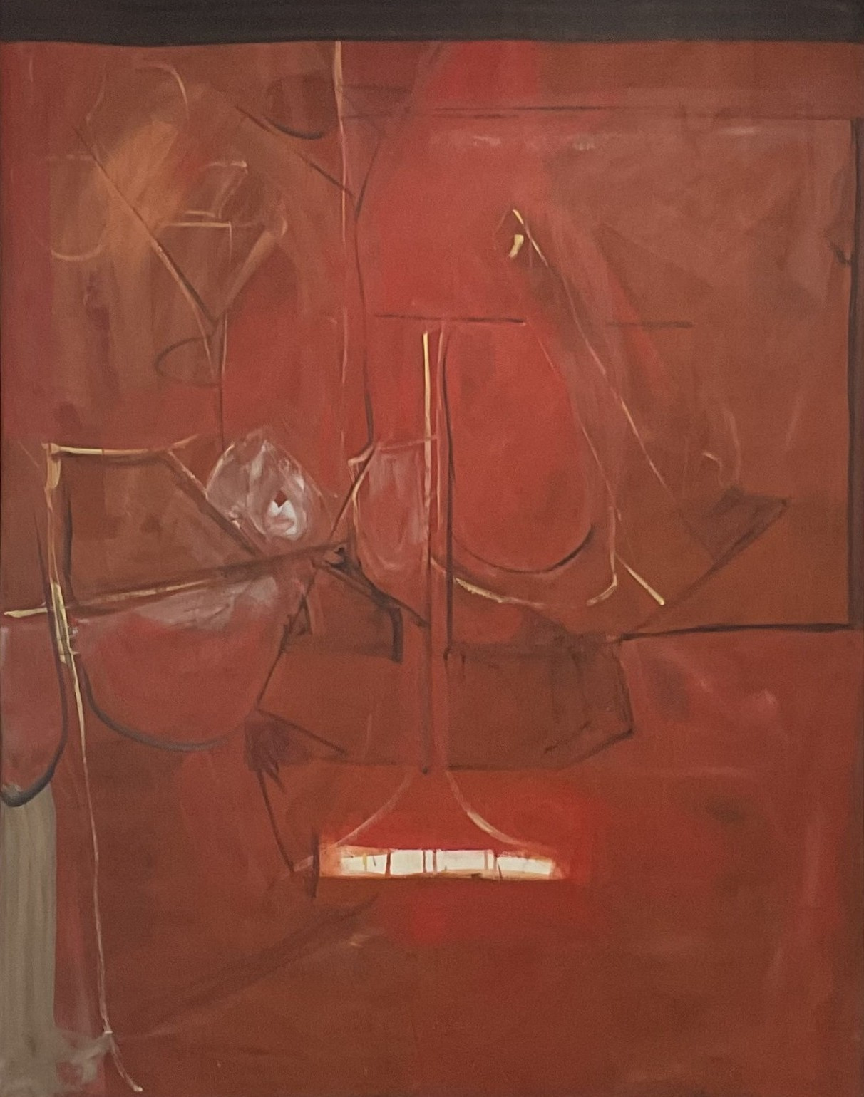 Item description: The painting is non-representational. A sense of depth is created by the interplay of varying tones and brushstrokes. The dominant color is a deep, warm reddish-brown with light beige lines and shapes creating different layers.