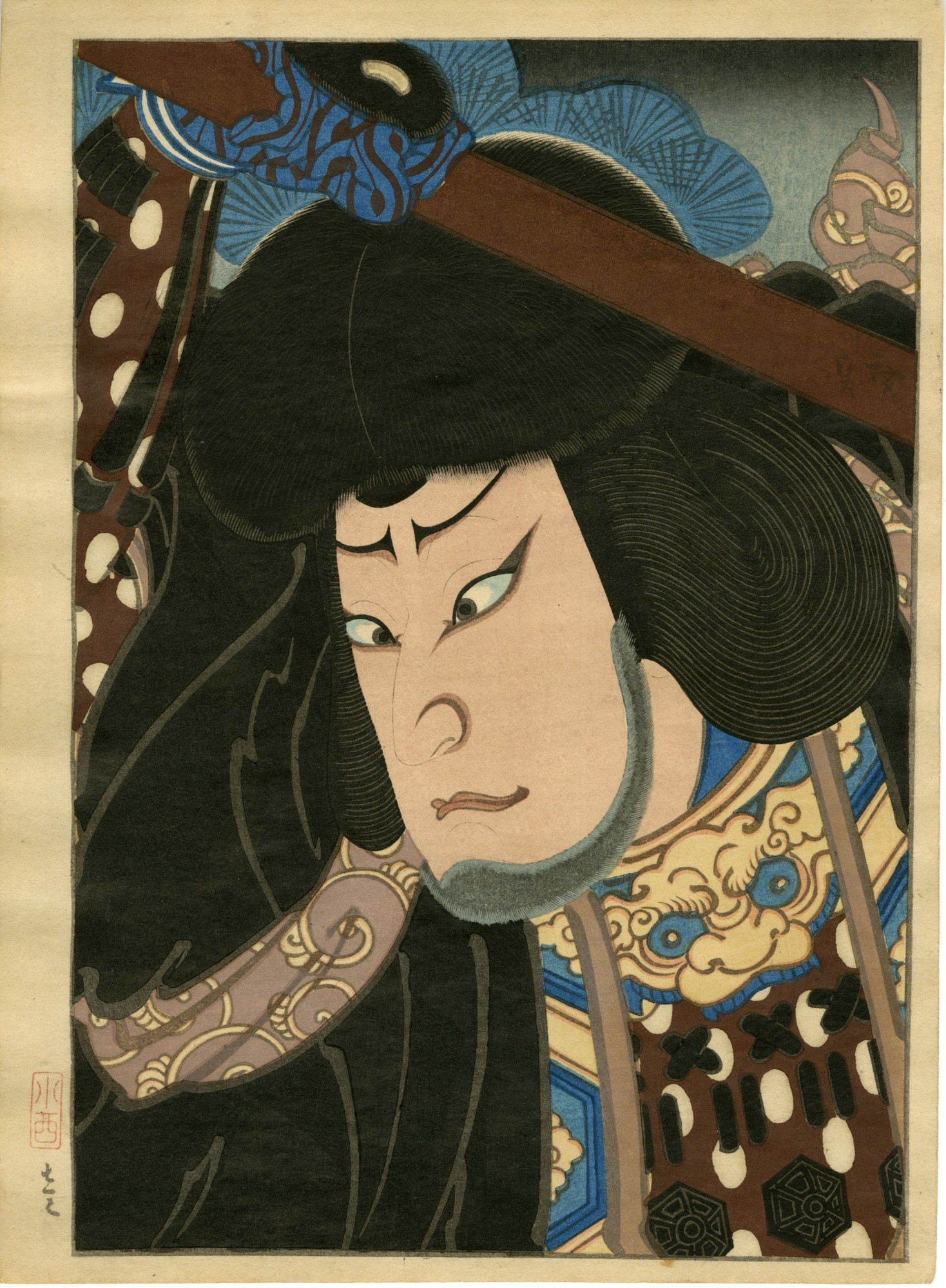 Item Description: Actor with black hair and hat, light gray/blue short beard, and blue dragon neck/dress wear.