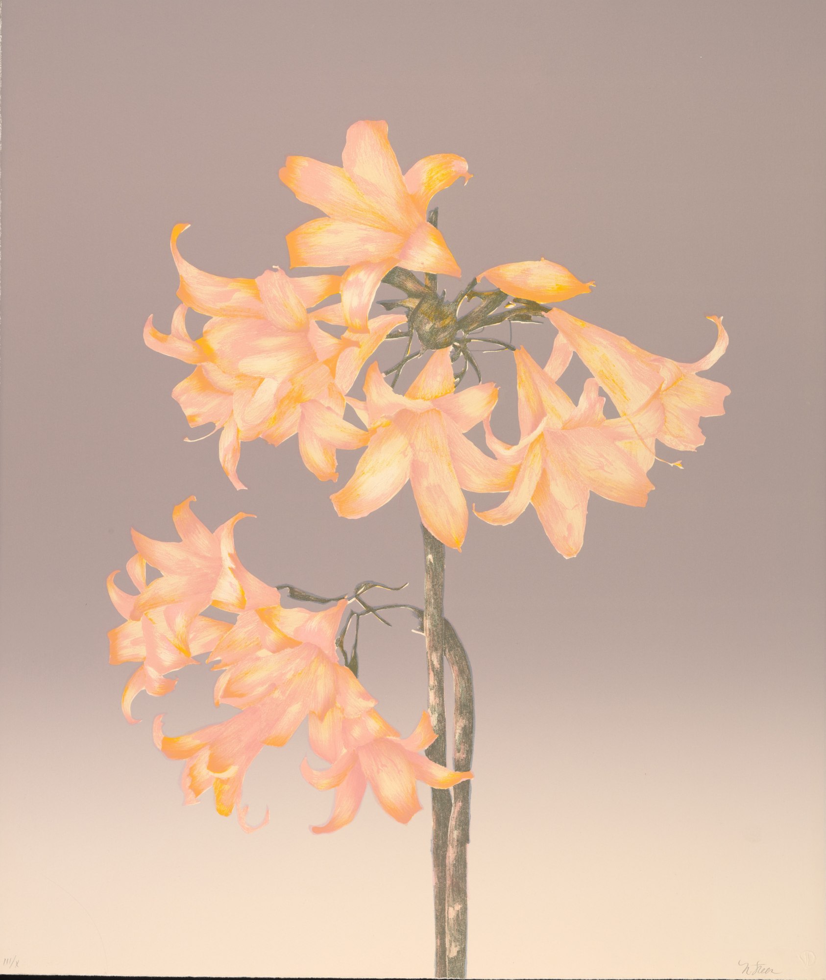 Item description: Peach lilies on grey background.