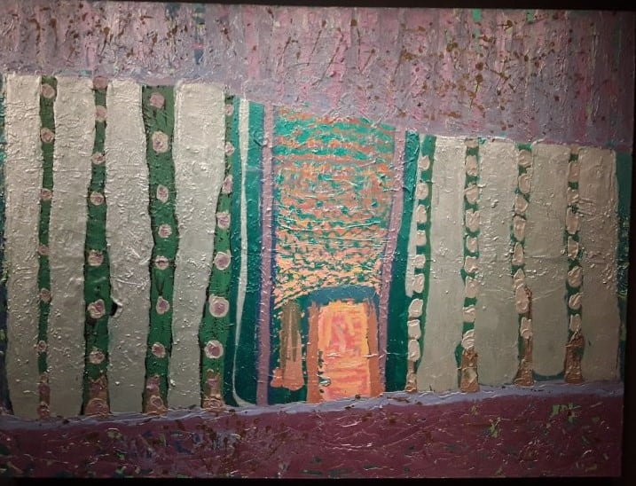 A symmetrical painting that uses green, grayish-gold, and orange.