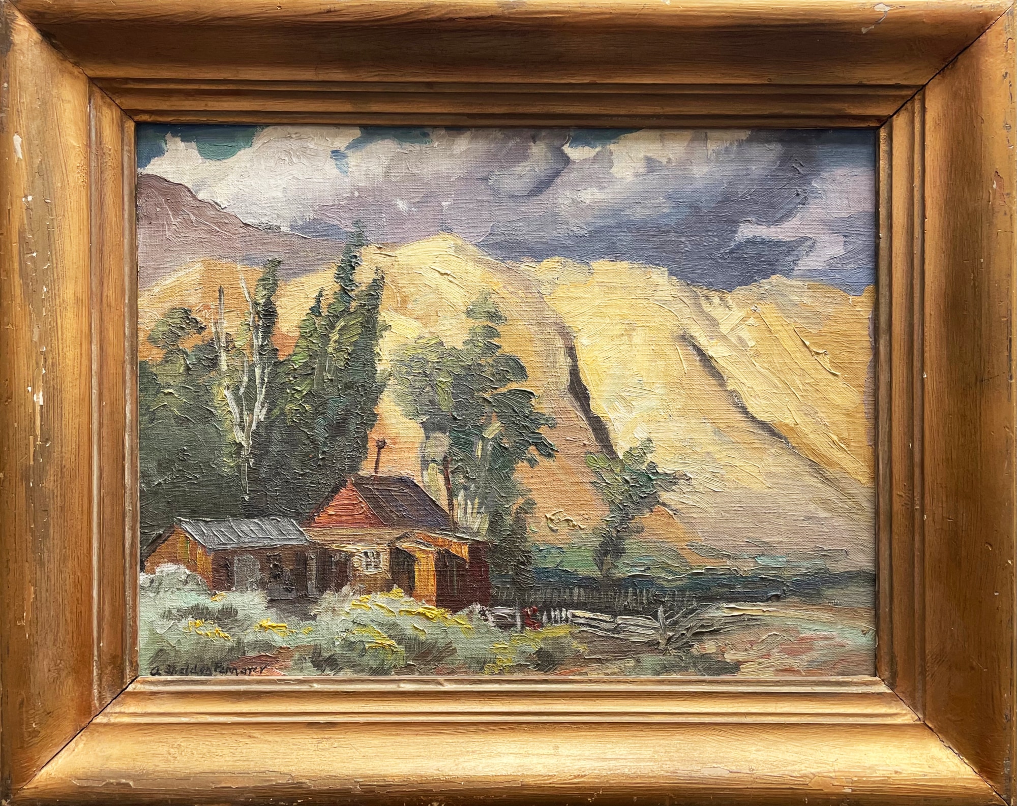 Item description: A house and a shack near mountains.