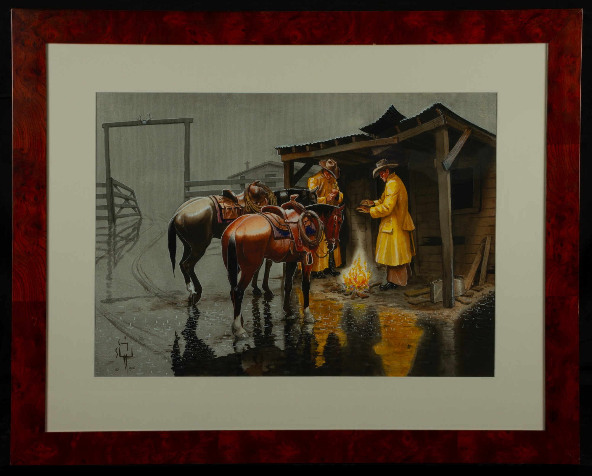 Item description: Two people dressed in yellow rain coats, warming themselves by a fire in a shed. Two horses awaiting beside them in the rain.