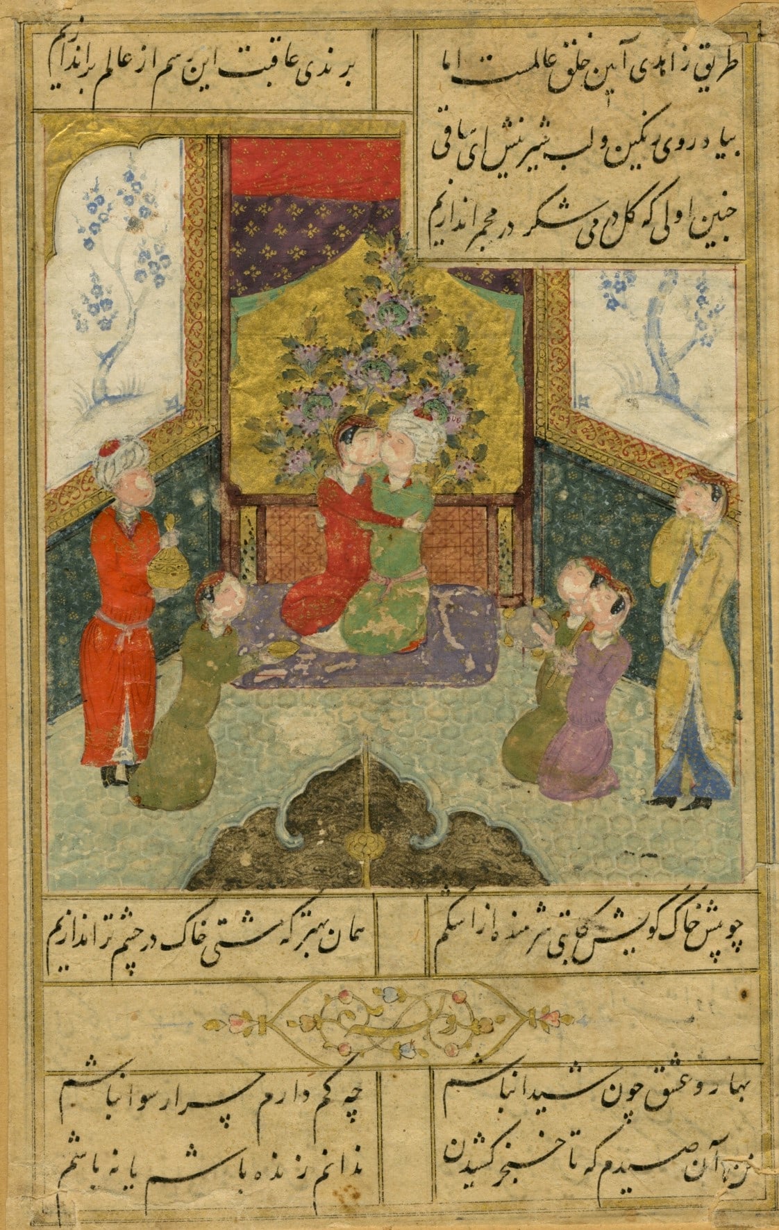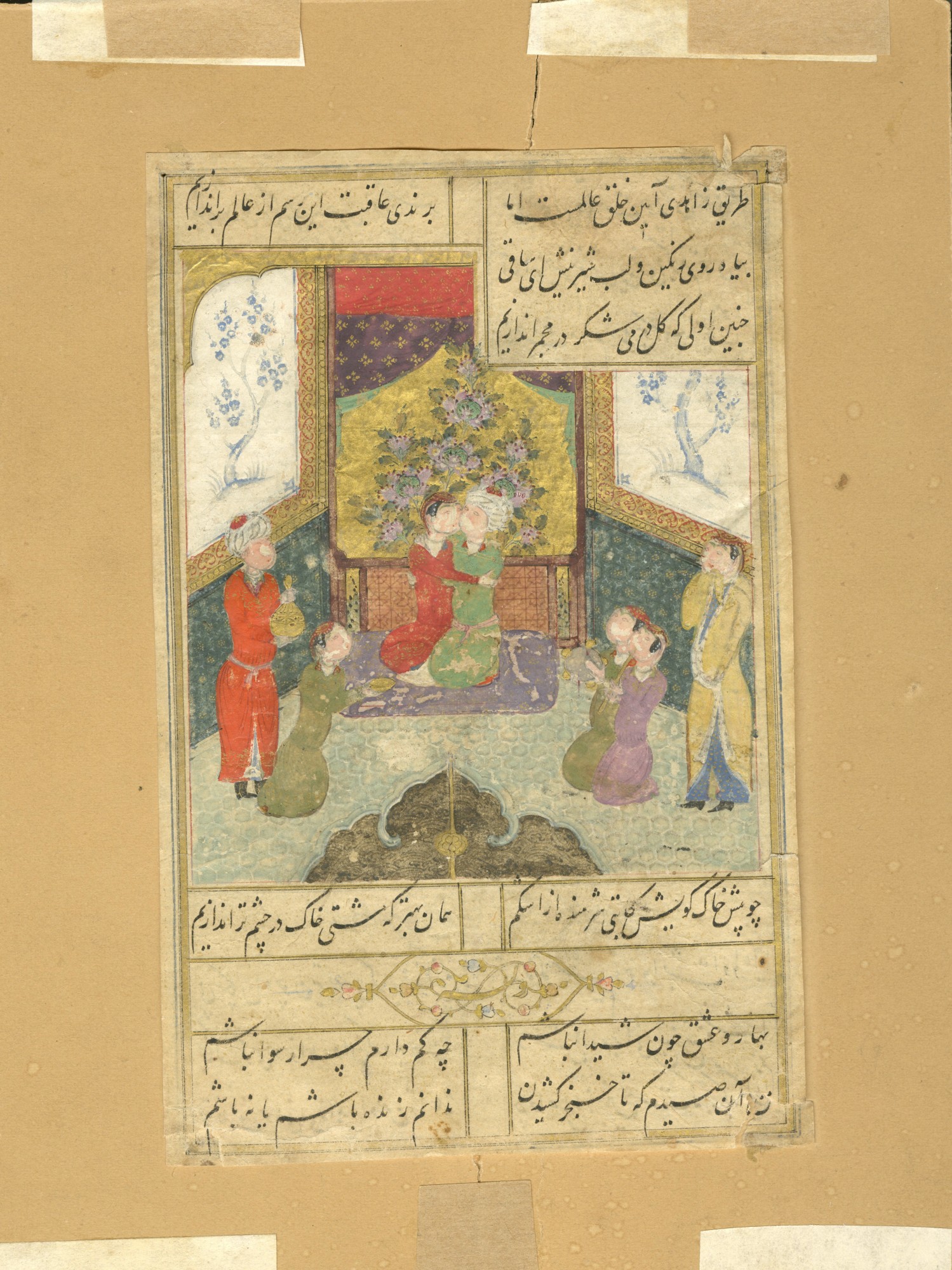 A 16th century hand paintined Safavid (Persian) book page possibly from the poem about Khosrow and Shirin by poet Nazami Ganjavi. It is a two sided book page with one side having a gouache, ink, and watercolor painting of a Persian room interior in the