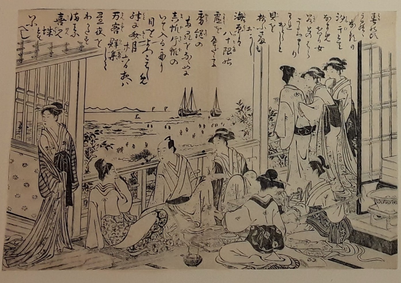 Party on a meranda overlooking a beach where people aree picking up shells from the sand. Two pannel, black ink.
