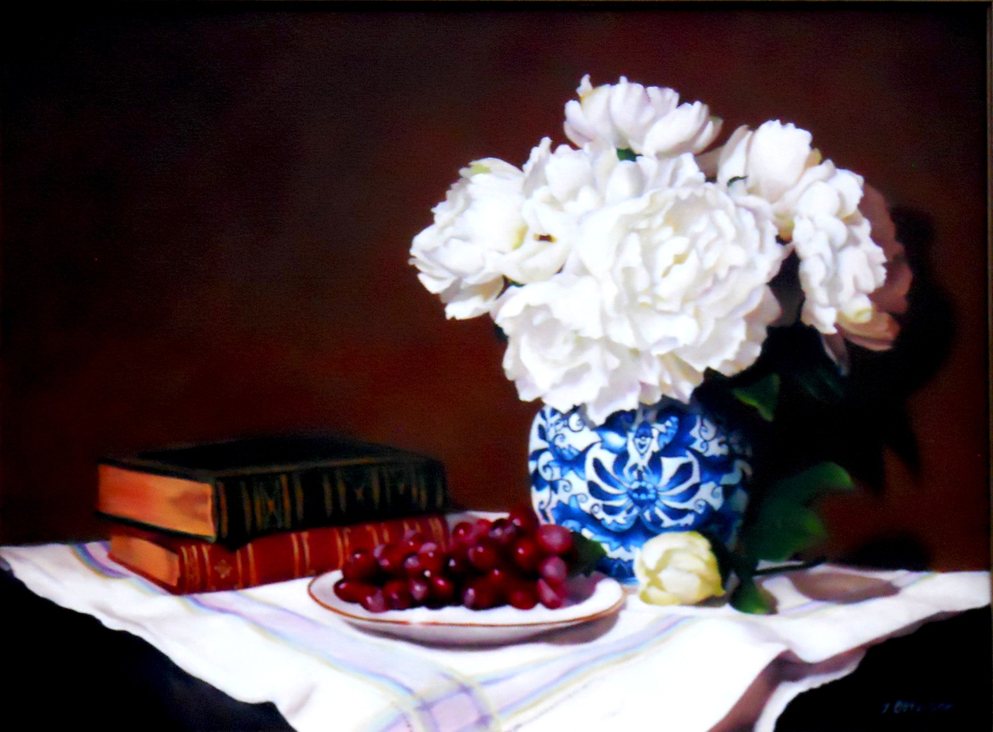 White Peonies in a blue and white vase with grapes and books. All on my grandmothers linen. This painting reminds me of her.