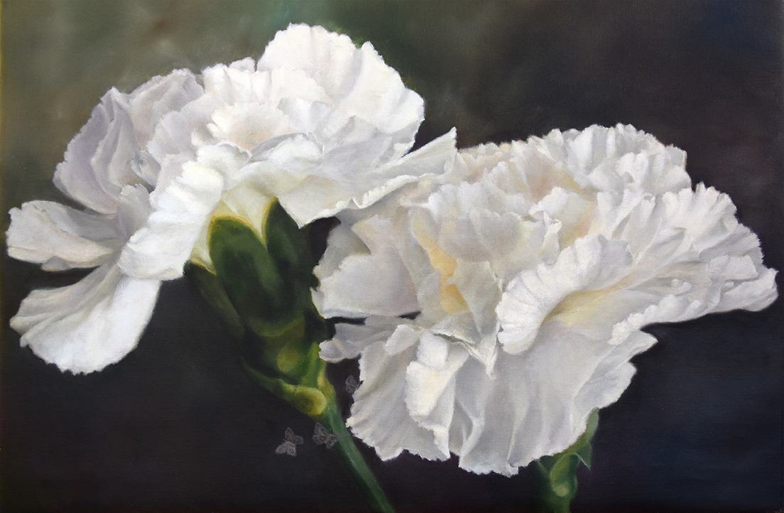 Two white Carnations, butterflies on a dark background