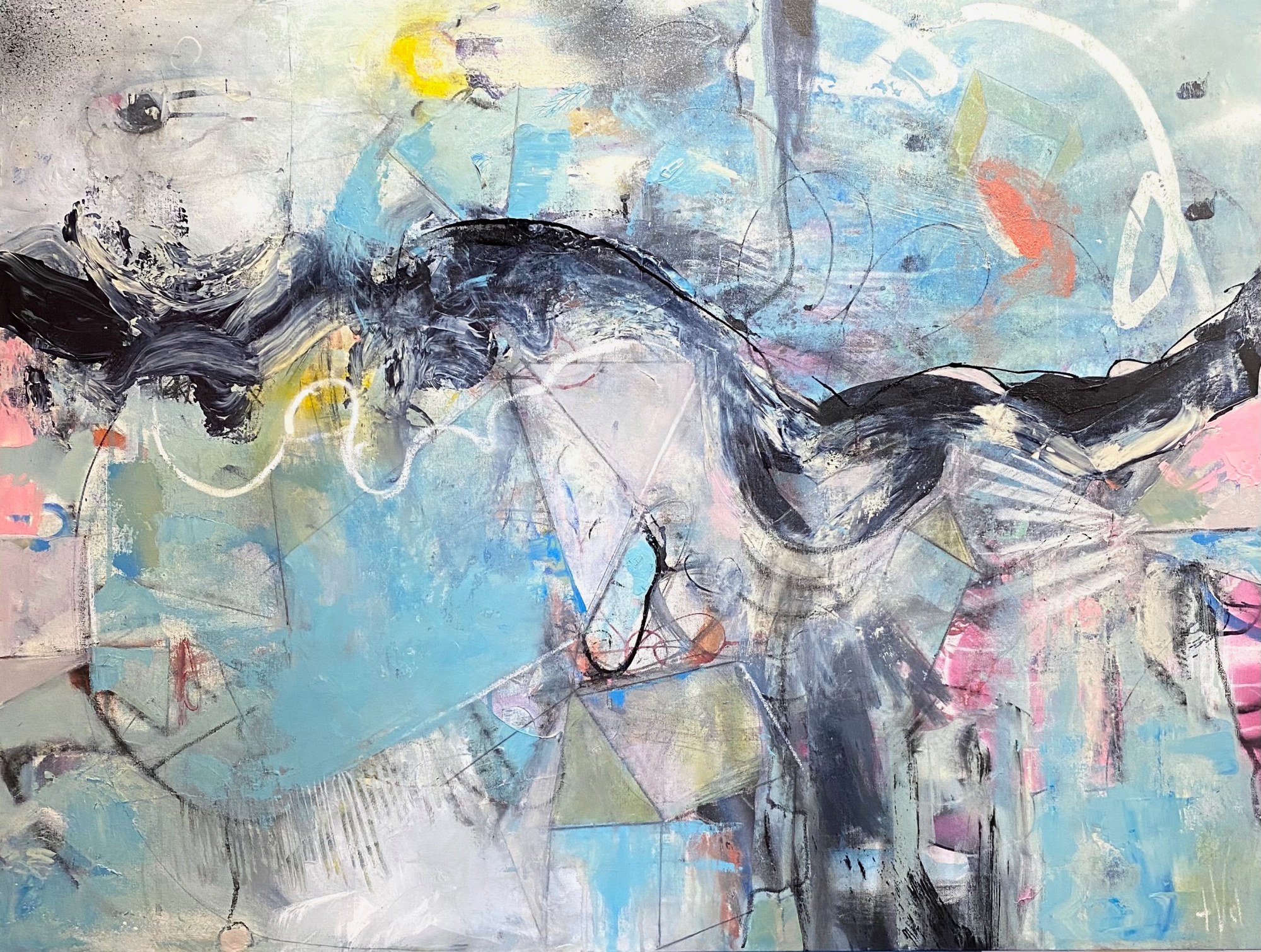 Floating, dreamlike shapes and imagery, soft color applied intuitive and gesturally. Acrylic, oil stick, spray paint, ink and pencil on a streched canvas ready to hang.