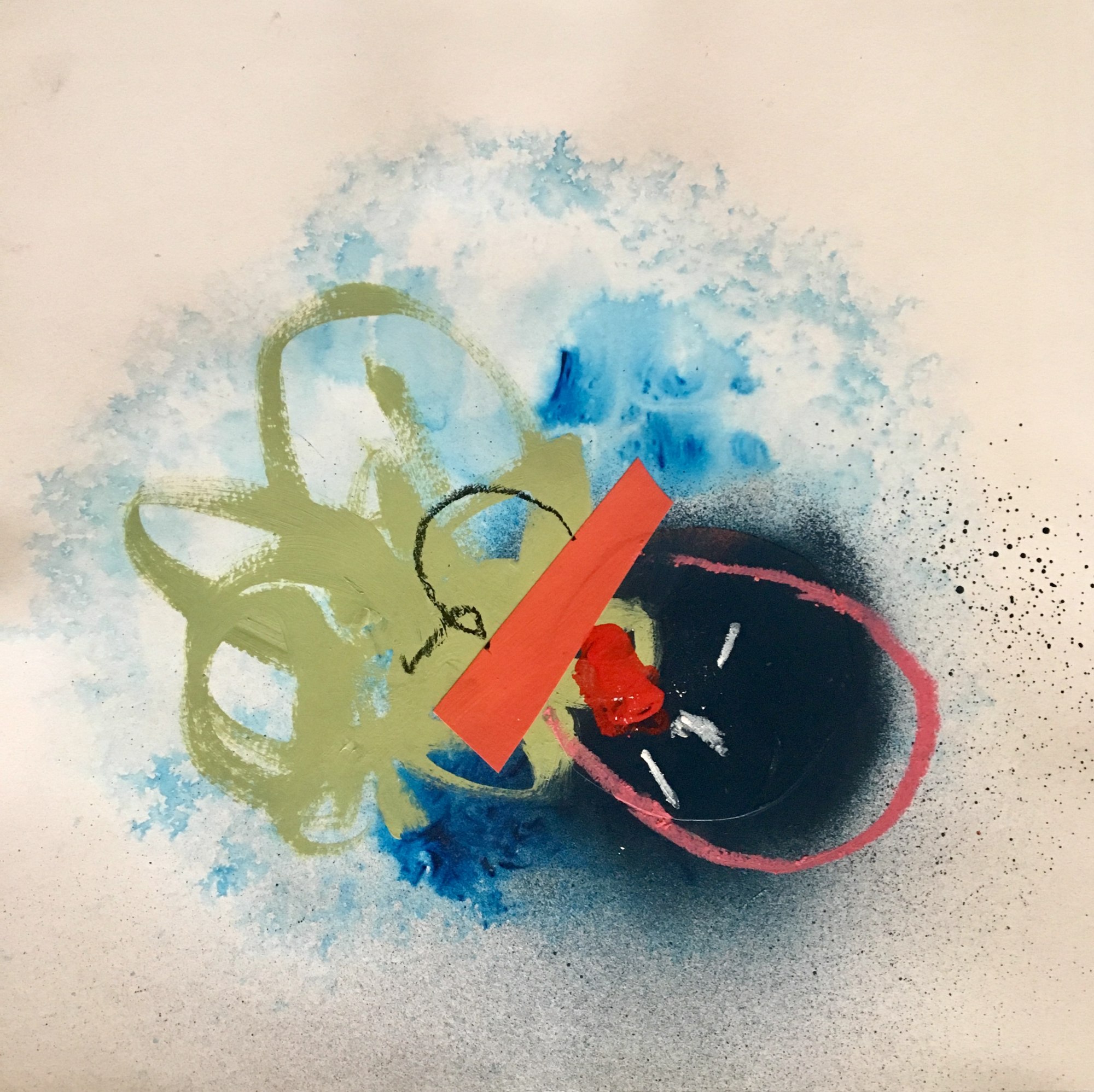 Mixed media on paper sandwiched in acrylic and framed with natural wood. Frame is 20x20 and art is 12x12.
