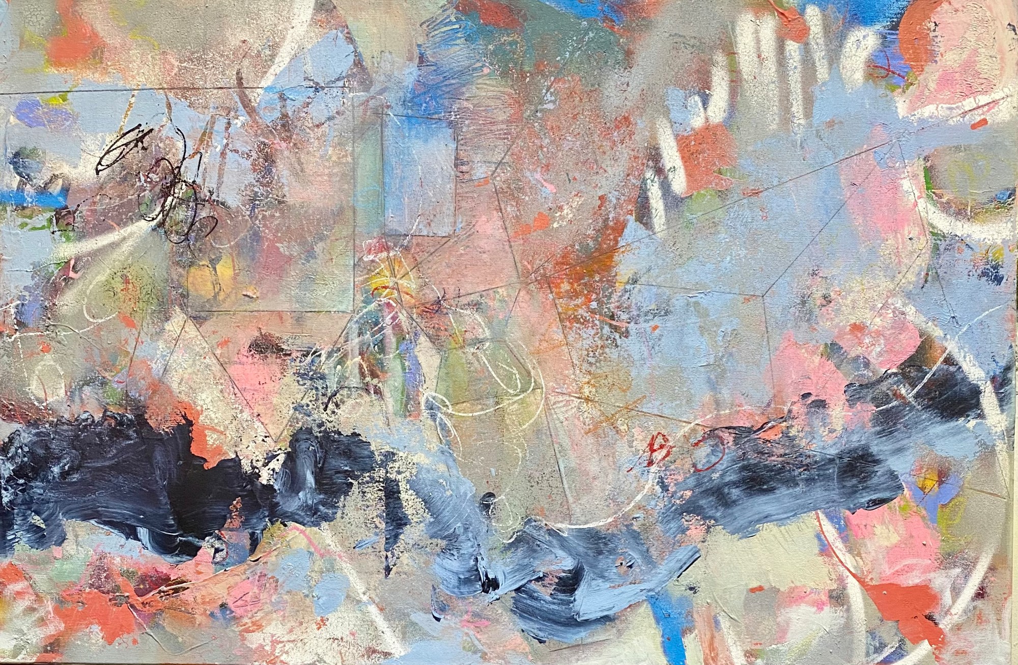 Acrylic, sparay paint, ink, pencil and oil stick on wood panel