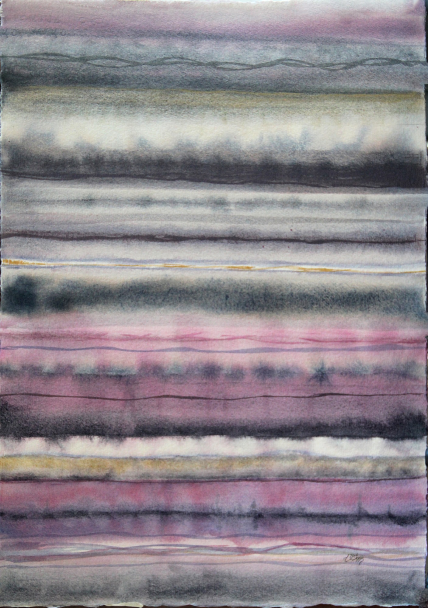 Granulating colors of Fuchsia and Greys gently play across the page and are embellished by metallic golds and silvers. This piece is floated on a soft mat of grey and framed stylishly in a modern wood grain grey.