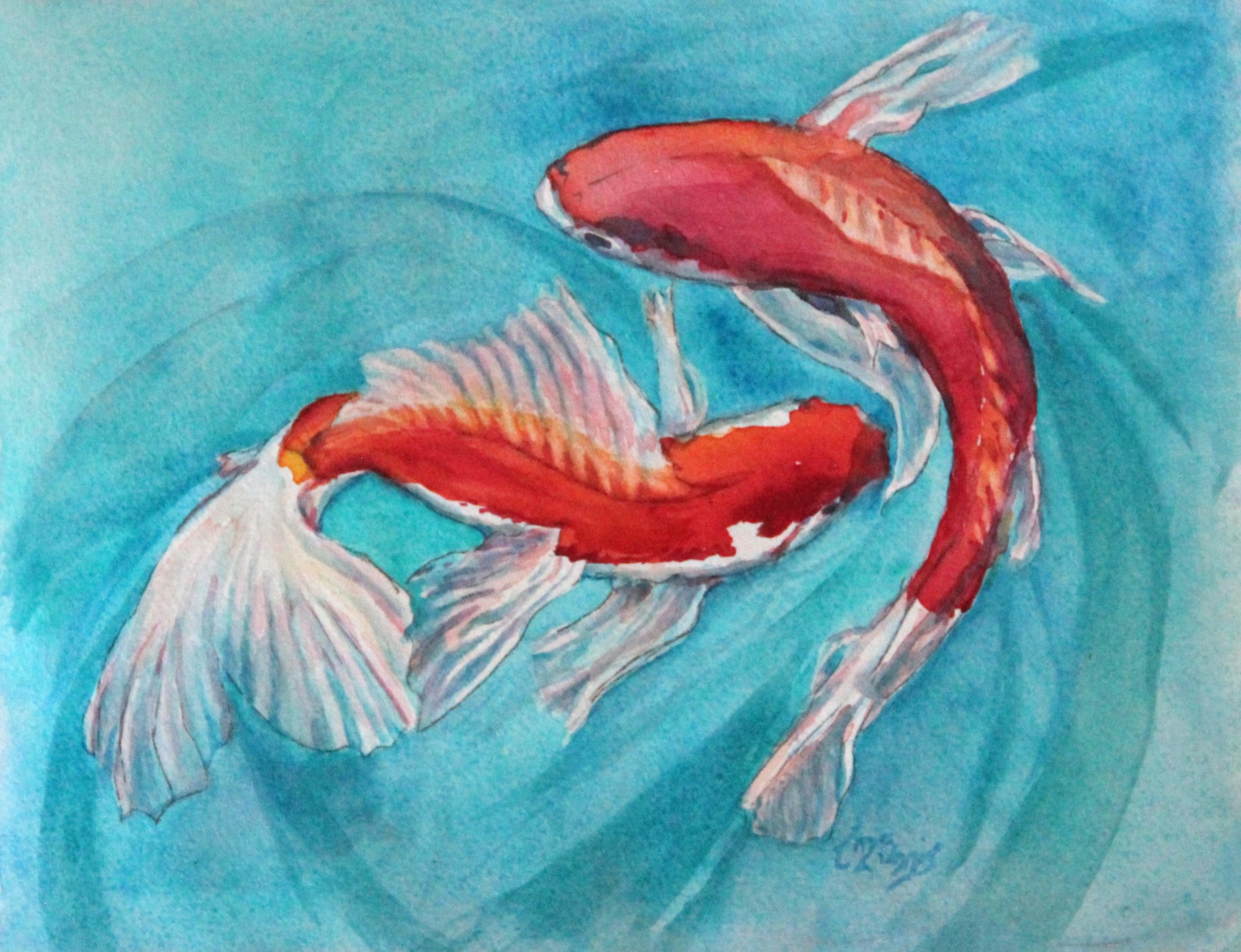 Playful golden red Koi make for a playful contrast swimming in a pond of aqua.