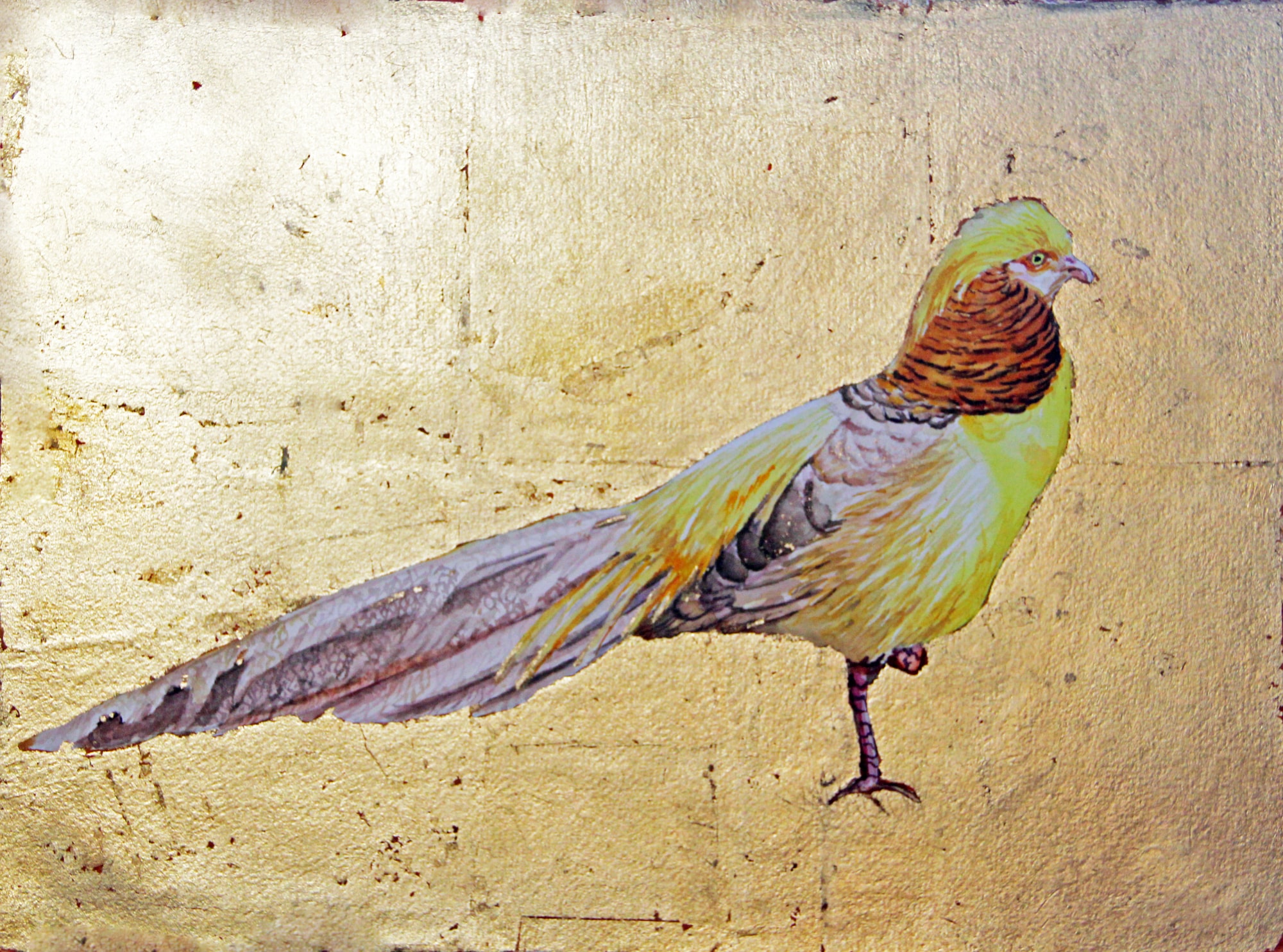 The golden pheasant, with its vibrant and exotic plumage, takes center stage in the artwork, drawing the viewer's attention with its intricate details and vivid colors. The use of gold leafing as a background not only adds a touch of opulence but also enhances the pheasant's regal presence.