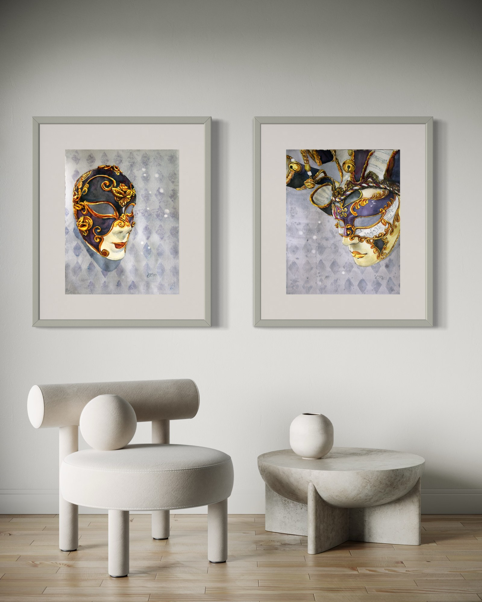 Venetian Mask on a stylized Harlequin background that suggests of a sedate celebration. 11x14 watercolor