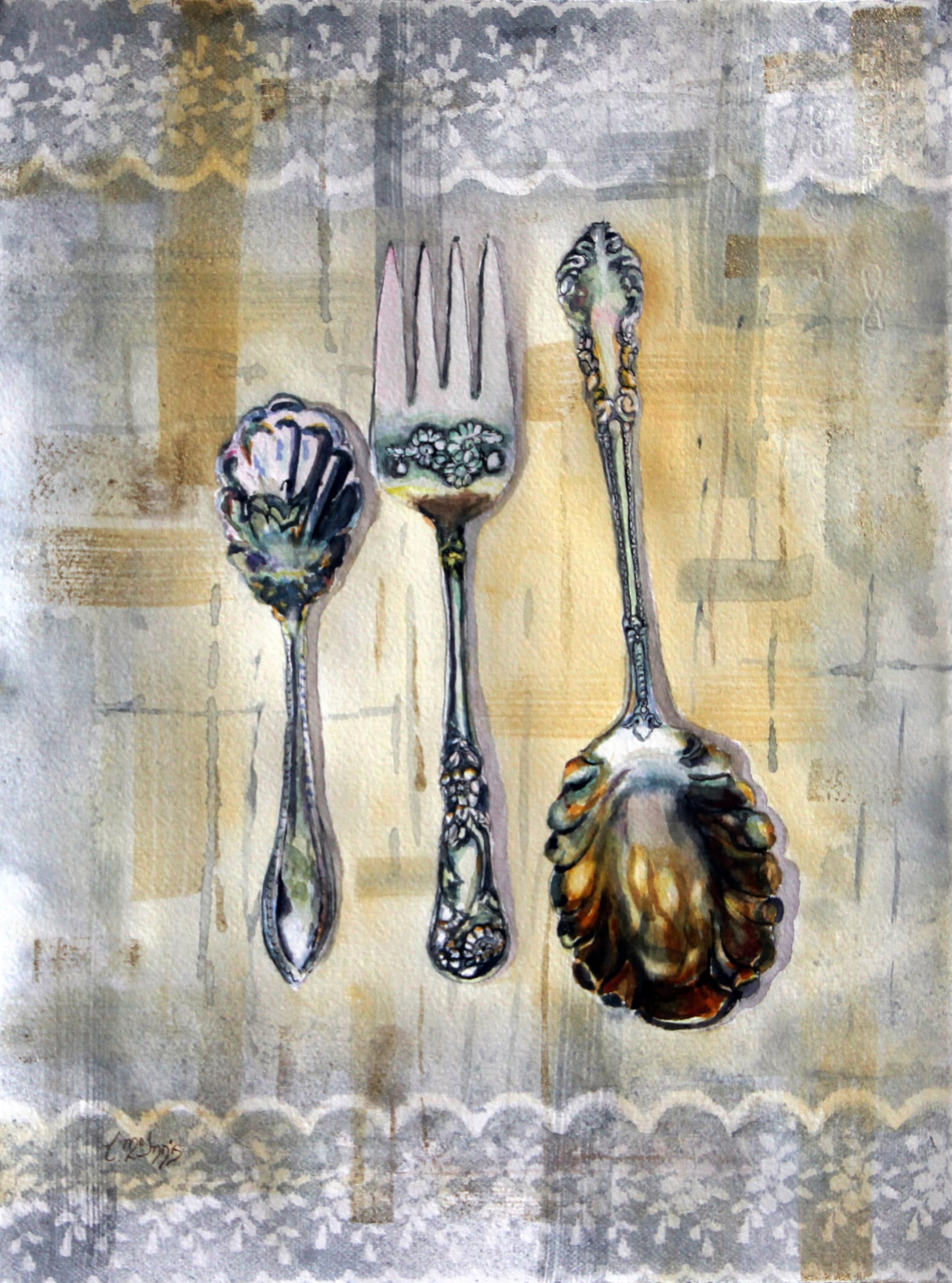 "In Service" is a watercolor that bridges the past and present by juxtaposing delicate heirloom flatware with a minimalist, contemporary background. The intricate details of the silverware evoke a sense of nostalgia and tradition, while the modern backdrop—alive with metallic colors and abstract strokes—suggests a dynamic interplay between history and innovation. Part of the "Contemporary Heirlooms" series, the piece celebrates the enduring beauty and stories of family treasures, reimagined within the context of modern aesthetics, inviting viewers to reflect on the timeless value of objects passed down through generations.