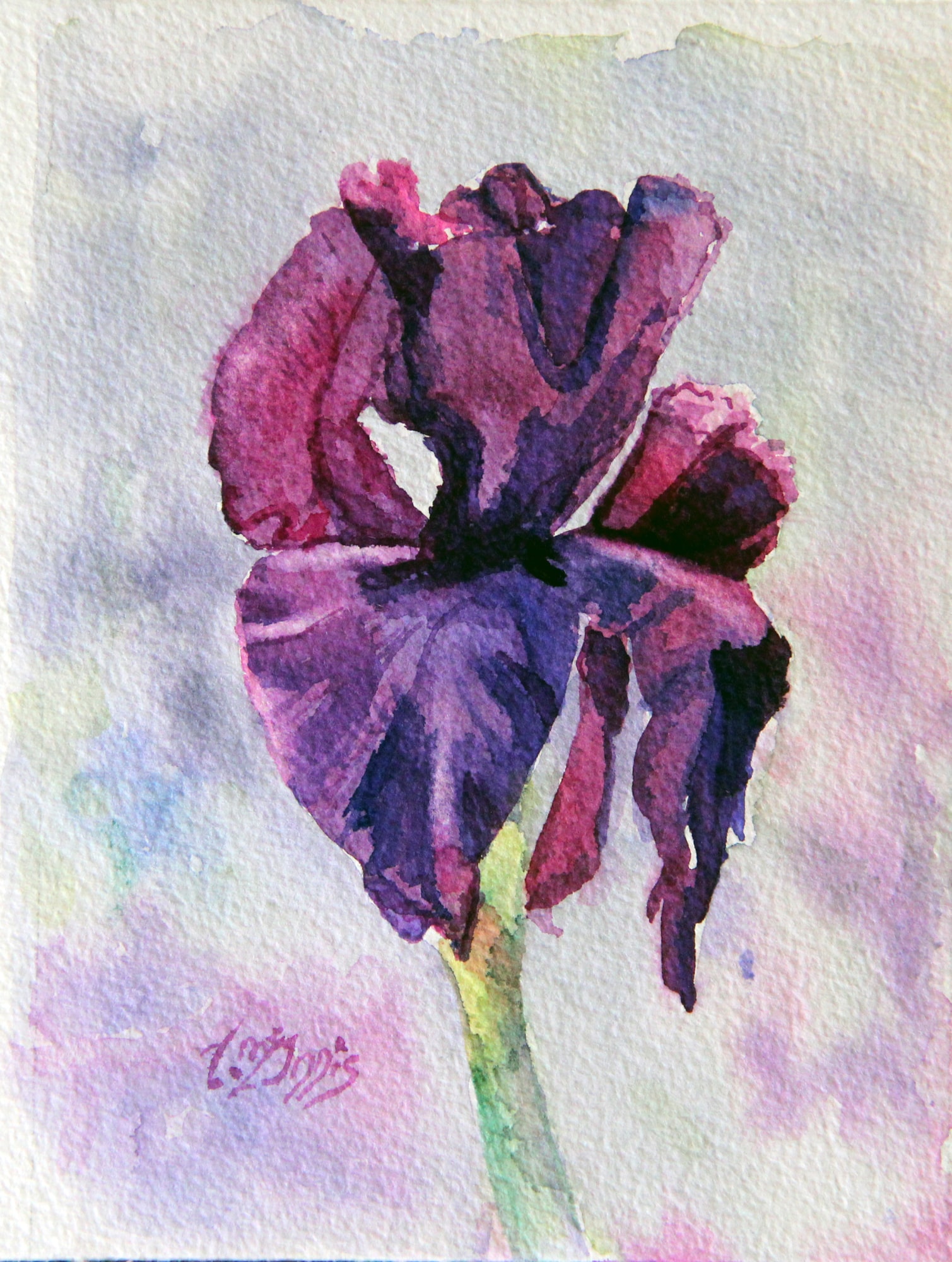 In this exquisite 5x7" watercolor painting, the delicate beauty of a single purple iris unfolds with grace and precision. The artist's skillful brushstrokes capture the intricate details of the flower's velvety petals, each one delicately unfurling in a harmonious dance of color. Shades of lavender and lilac blend seamlessly, creating a soft gradient that gives depth to the ephemeral bloom. The ethereal quality of the painting is heightened by subtle washes of watercolor, allowing for a gentle translucency that hints at the flower's fragility. Against a muted background, the iris stands as a solitary, elegant subject, embodying a moment frozen in time. The painting's compact size invites close inspection, inviting viewers to lose themselves in the intricate charm of this miniature masterpiece