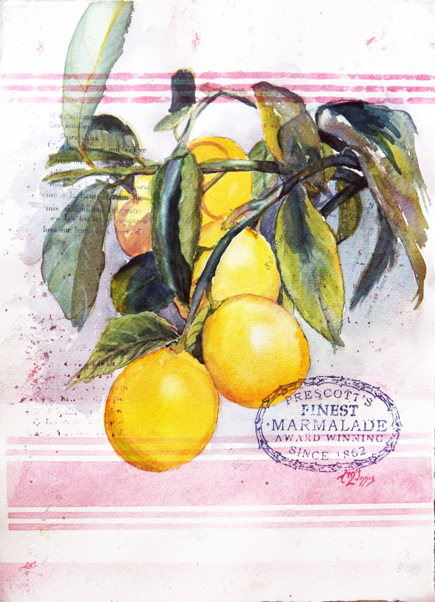 We had a good citrus crop this year and I have created several "kitchen" paintings using them as inspirations. This is one of them, it's a lot of fun! I have pulled in a background pattern to give this a French tea towel look. Let me know what you think of it.