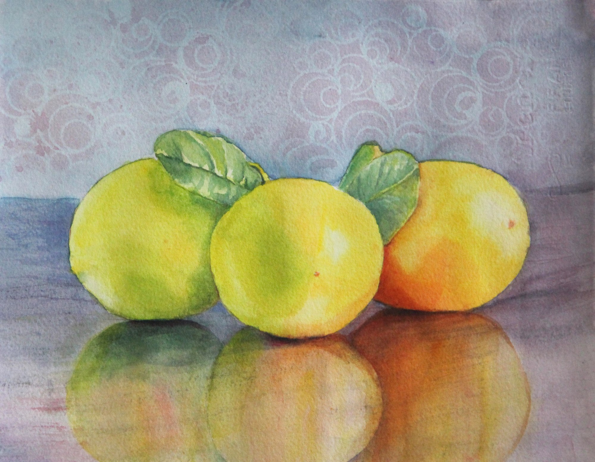 In this captivating watercolor composition, three Meyer lemons rest gracefully on a sleek stainless counter, their sunny yellow peels contrasting with the cool metallic surface. The artist portrays the texture of the lemons, capturing the subtle variations in their skin with delicate brushstrokes. The play of light creates a luminous quality, as soft shadows dapple the counter beneath the citrus trio. Against a backdrop of swirling patterns, reminiscent of a gentle breeze or a moment frozen in time, the lemons take center stage. The stainless counter, with its reflective properties, adds a modern touch, and the intricate swirl pattern background adds a sense of dynamic movement to the still life. The overall effect is both visually striking and harmoniously balanced, inviting viewers to appreciate the interplay of form, color, and texture in this exquisite watercolor masterpiece.