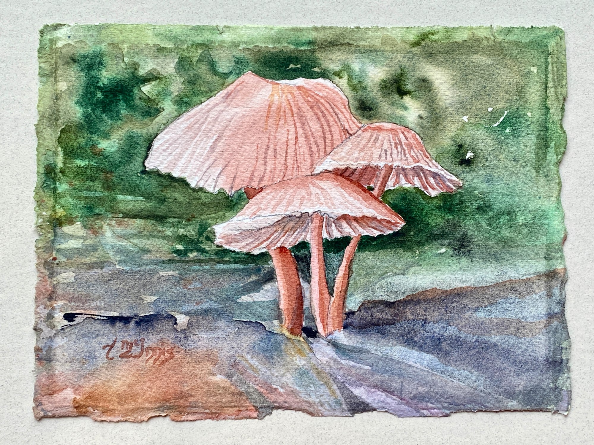 Soft colored peach mushroom with sunlight glowing through the caps. Piece is hand deckled around all sides and is mounted onto 8x10" mat ready for framing.