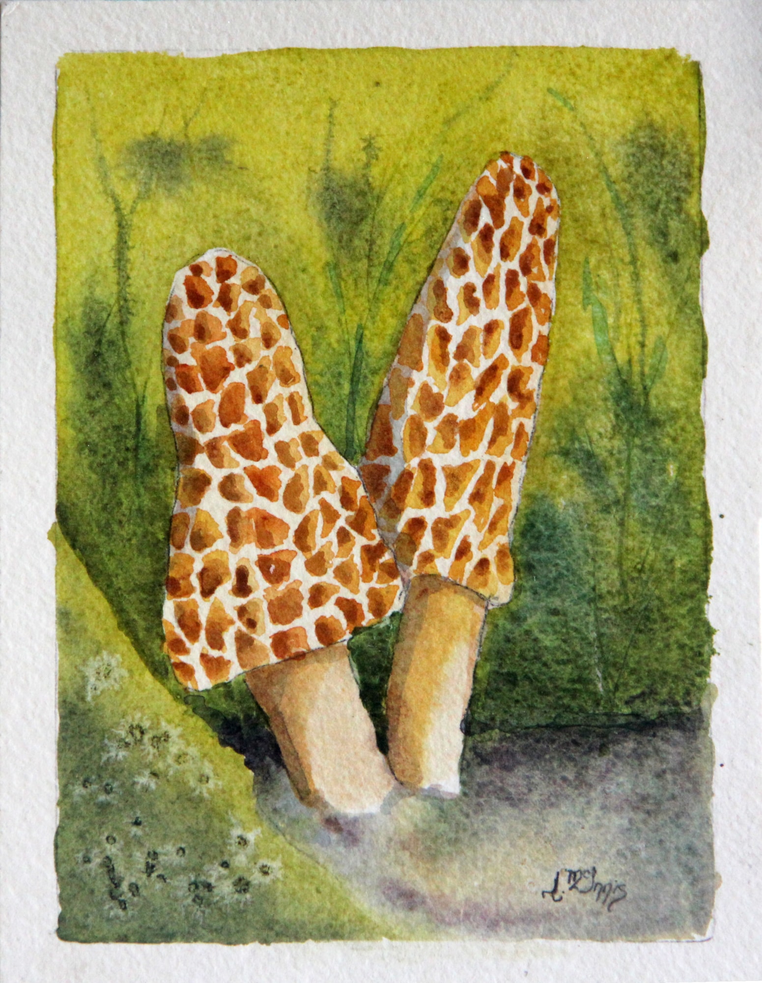 The velvety textured greens surround these delicately honey combed mushrooms.