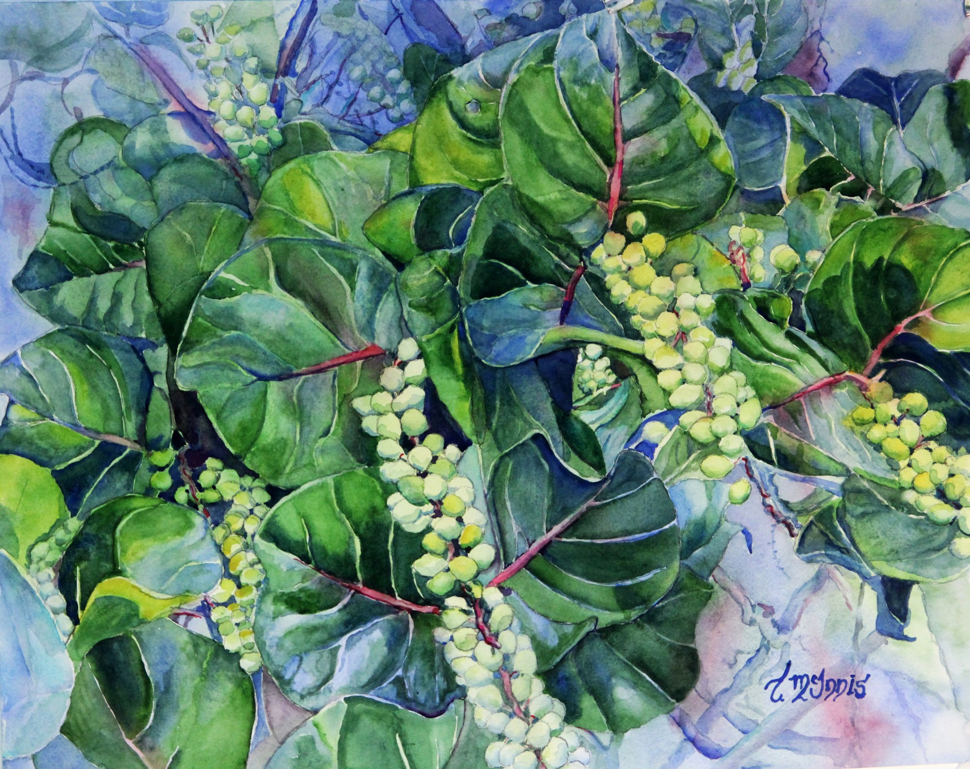 I was deeply intrigued by these plants I frequently see in south Florida. the leaves were almost leathery and yet translucent when back lit. The green grapes take on a frosted white texture growing in bunches. They are edible, though I've never tried the protected fruit, they're reportedly taste like muscadine.