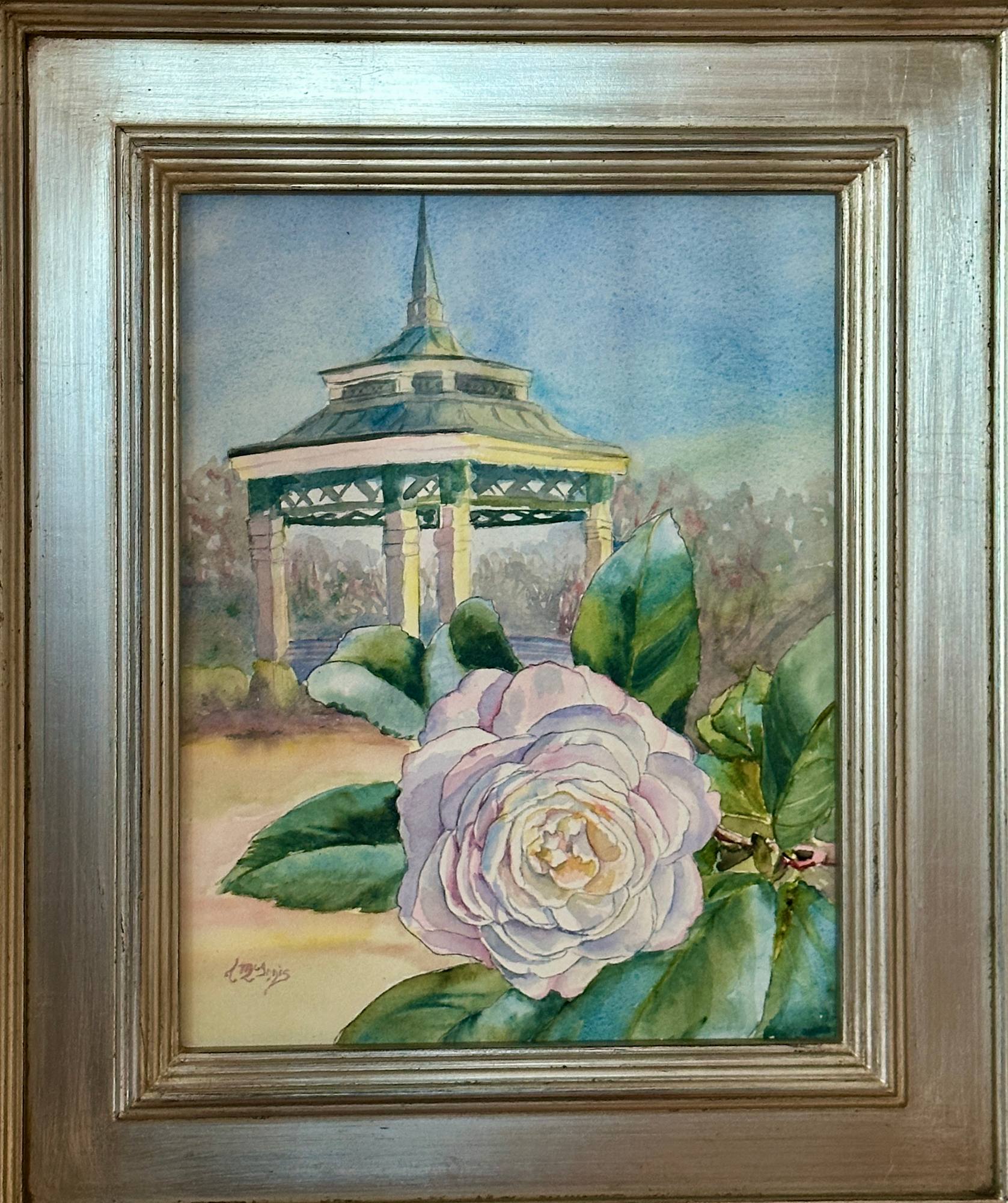 Charmingly elegant the Camellia's planted by the Monroe Garden club grace the presence of the old courthouse square where the Gazebos offer shelter from weather.