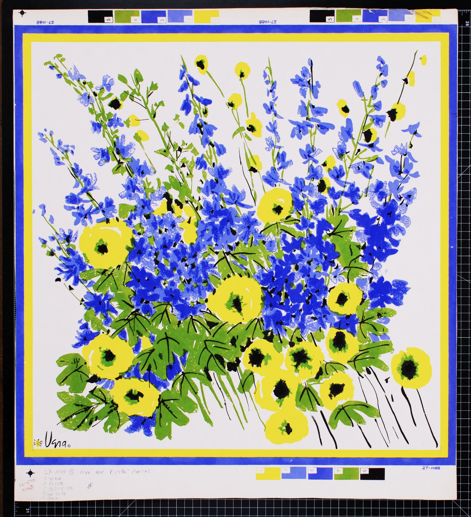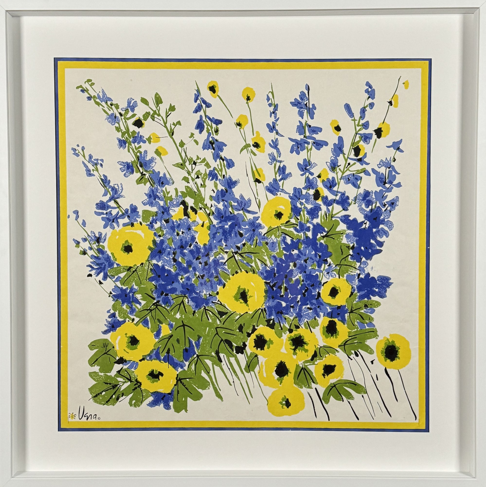 This vibrant silkscreen print showcases a lively bouquet of blue and yellow flowers, beautifully arranged to create a dynamic and cheerful composition. The blue blossoms, reminiscent of Blue Bells, stand tall amidst the bright yellow flowers, which resemble buttercups. Lush green foliage adds depth and contrast, enhancing the vivid colors of the blooms. A blue and yellow border frames the artwork, tying the composition together with a touch of elegance. This silkscreen captures the joyful essence of a blooming garden, perfect for infusing any space with mid-century charm and natural beauty.