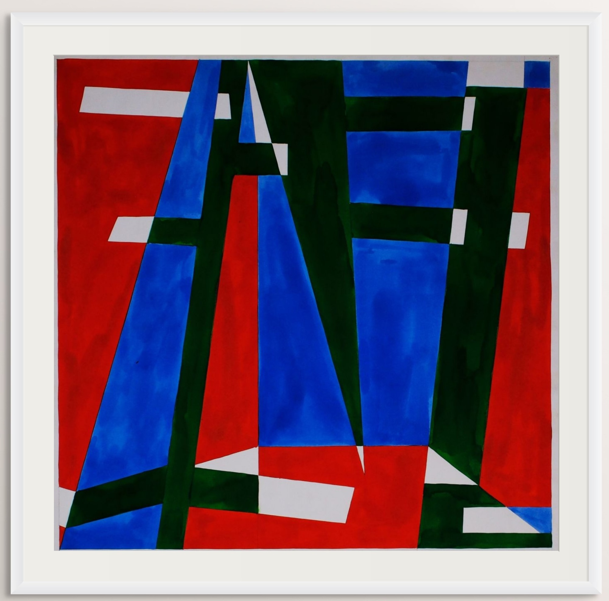 Step into a bold intersection of form and color with this striking composition that plays with the boundaries of abstraction. A dynamic tangle of red and green angular shapes jostles against blocks of brilliant blue, creating a lively visual tension. This is a confident, exuberant celebration of primary colors, a piece that doesn't shy away from making a statement. The deliberate placement of each hue constructs a sense of depth and architecture, inviting the viewer to navigate the imagined spaces within. It's a graphic mélange that's sure to evoke curiosity and admiration, perfect for invigorating a contemporary space with a splash of avant-garde energy.
