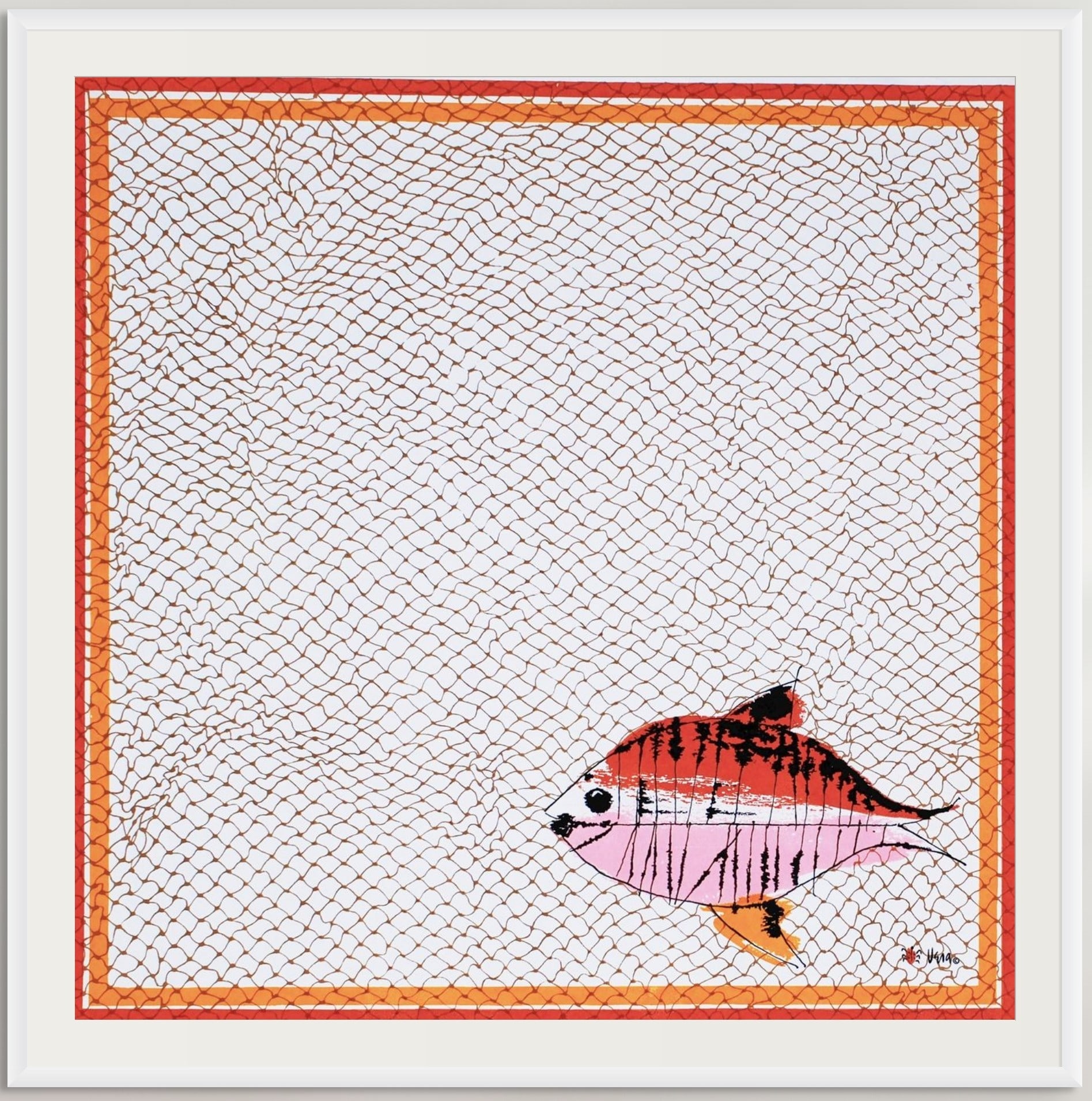 A whimsical fish, adorned with vibrant stripes of red, pink, and black, swims in a serene pose. Its rounded body, accentuated by delicate black lines, evokes a sense of gentle movement. The fish's large, expressive eye and small mouth add a touch of character, while its bright orange fin stands out vividly. Trapped within an intricately woven net, the fish's colorful form contrasts sharply with the structured, repetitive pattern surrounding it, highlighting the delicate balance between freedom and constraint.