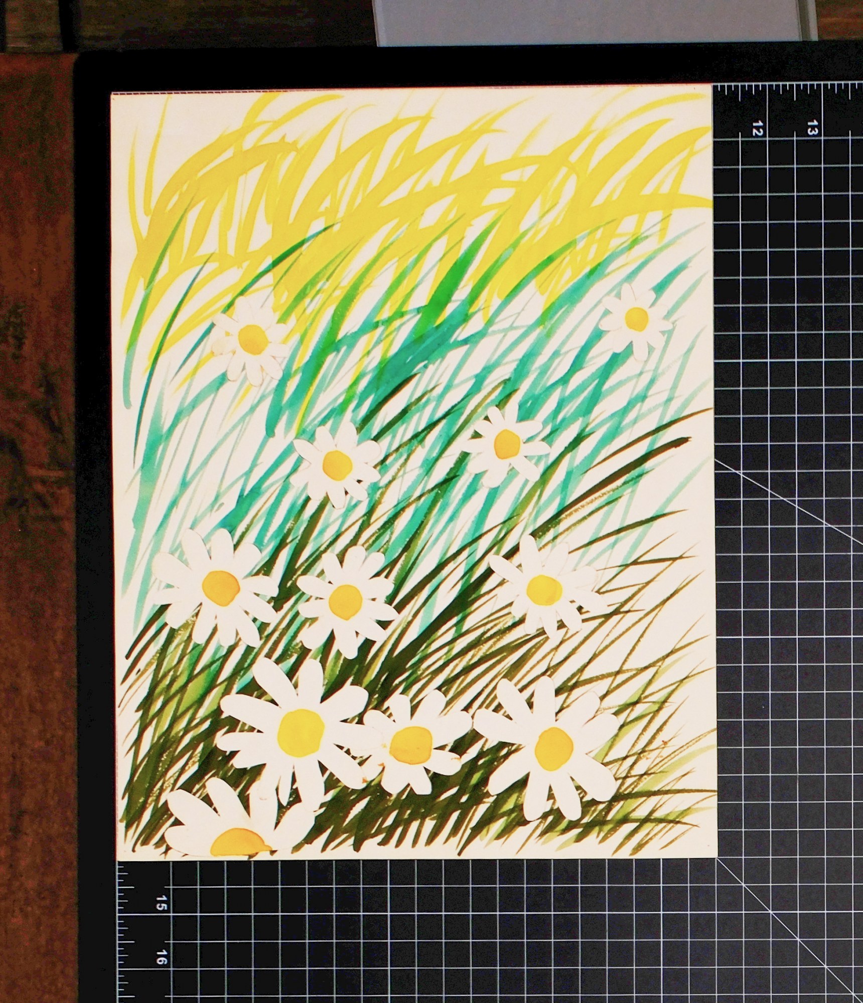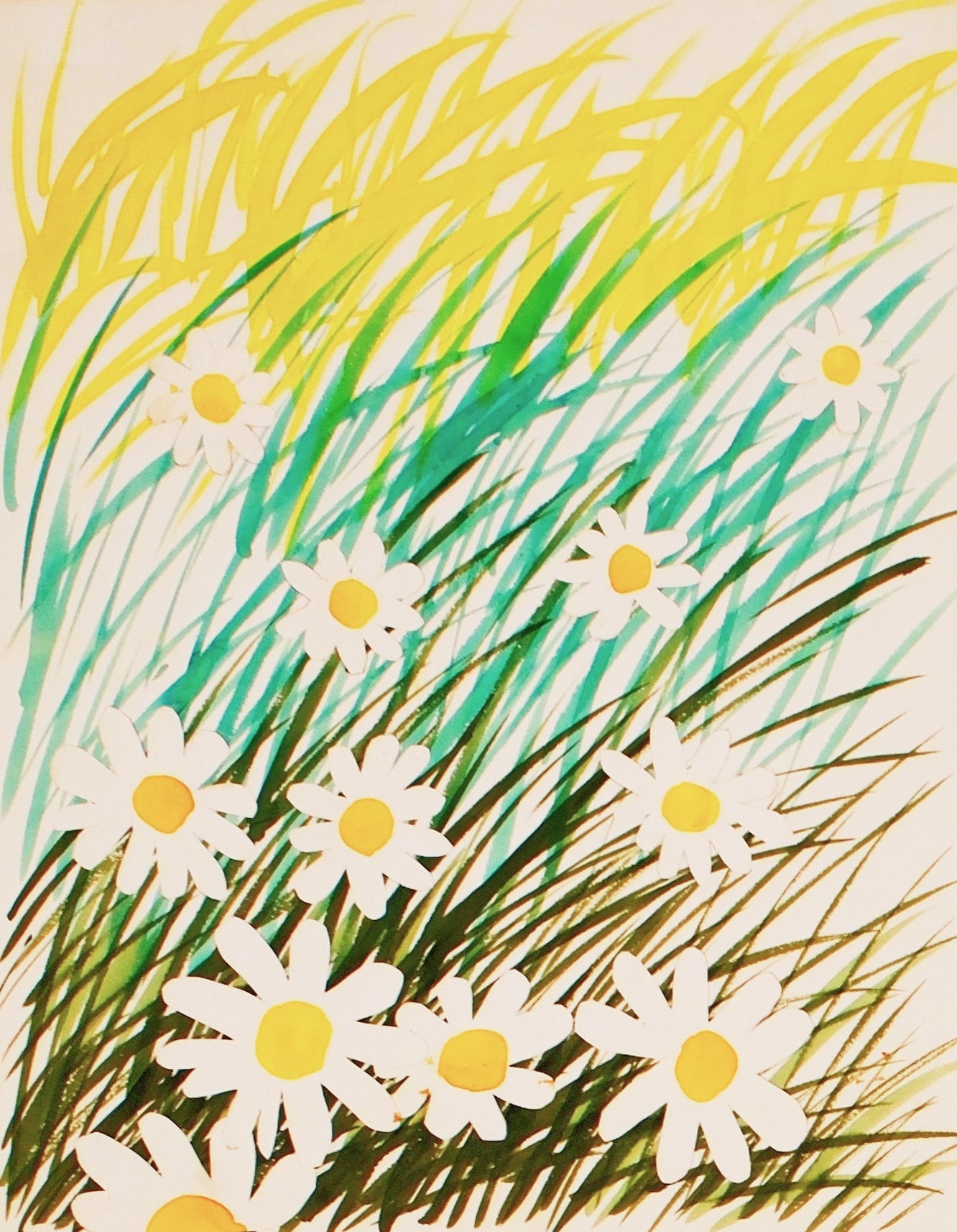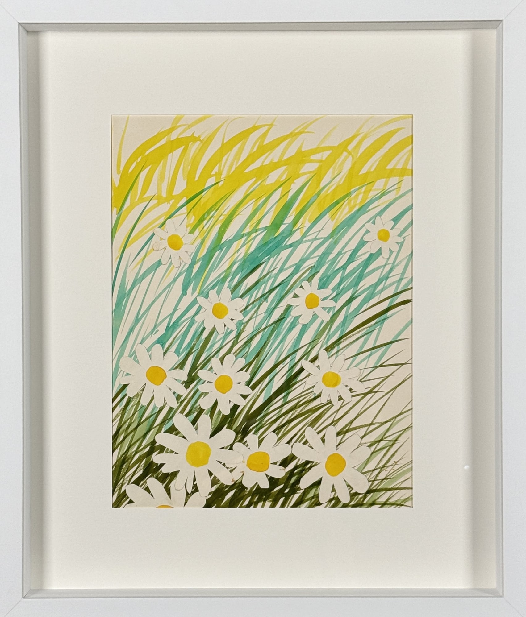 This watercolor illustration depicts a refreshing scene of white daisies peeking through a vibrant thicket of grass. The blades, painted in strokes of vivid yellow and cool teal, create a sense of movement, as if swaying in a gentle breeze. The daisies are simple yet striking with their bright white petals surrounding sunny yellow centers, providing a calming contrast to the dynamic background. This piece conveys the joy of a sunny day in a meadow, alive with the dance of flora in the wind. It would bring a natural, soothing element to any interior, reminiscent of lazy summer days spent lounging in the grass.