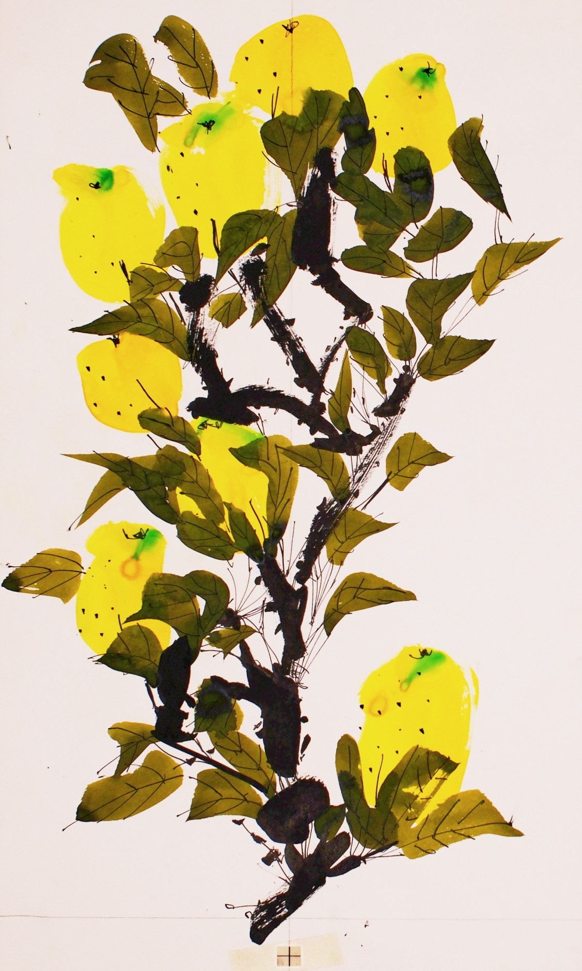 Bright yellow loquats dangle from slender branches, their cheerful hue a striking contrast against the dark, detailed stems. The glossy green leaves, intricately veined, provide a lush backdrop to the vibrant fruit. Each loquat, plump and inviting, adds a pop of color that exudes freshness and vitality. This captivating piece captures the essence of a fruitful harvest, bringing a touch of natural abundance and mid-century elegance to any space.