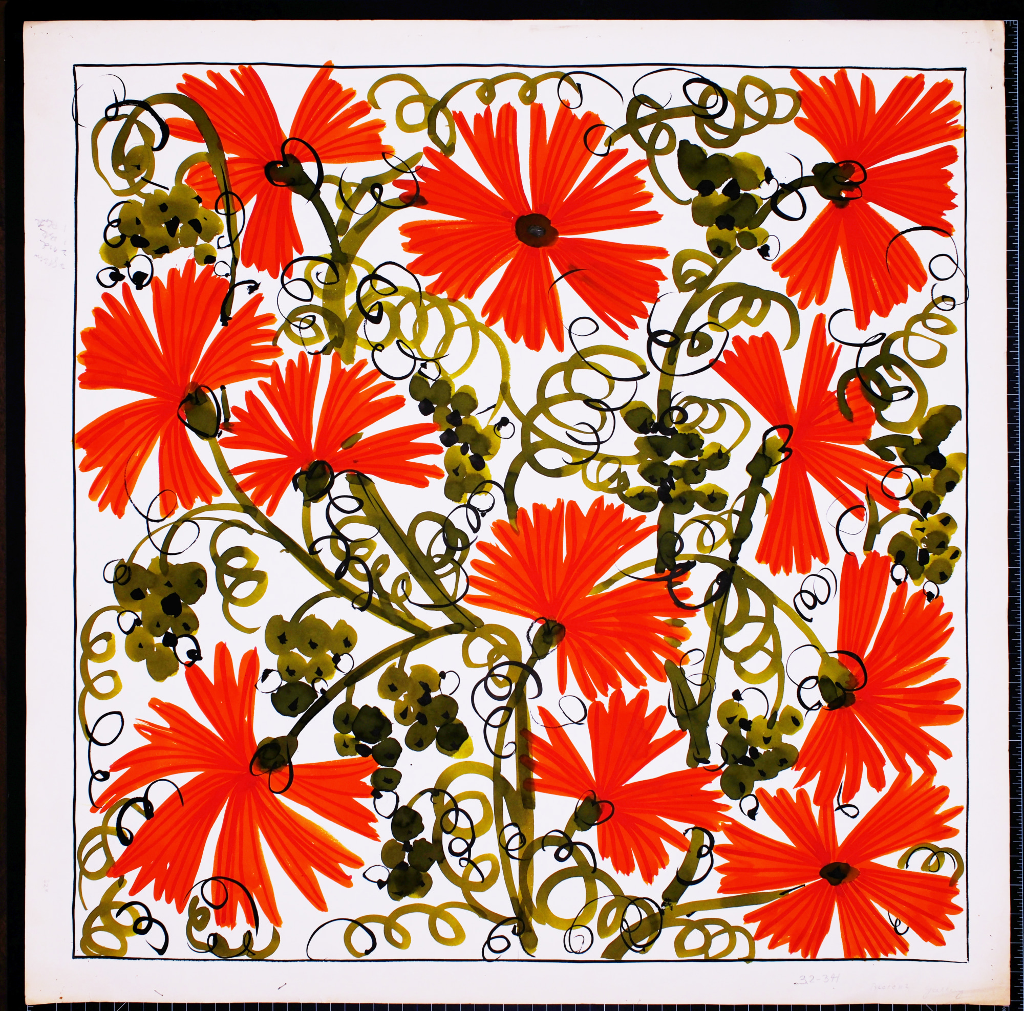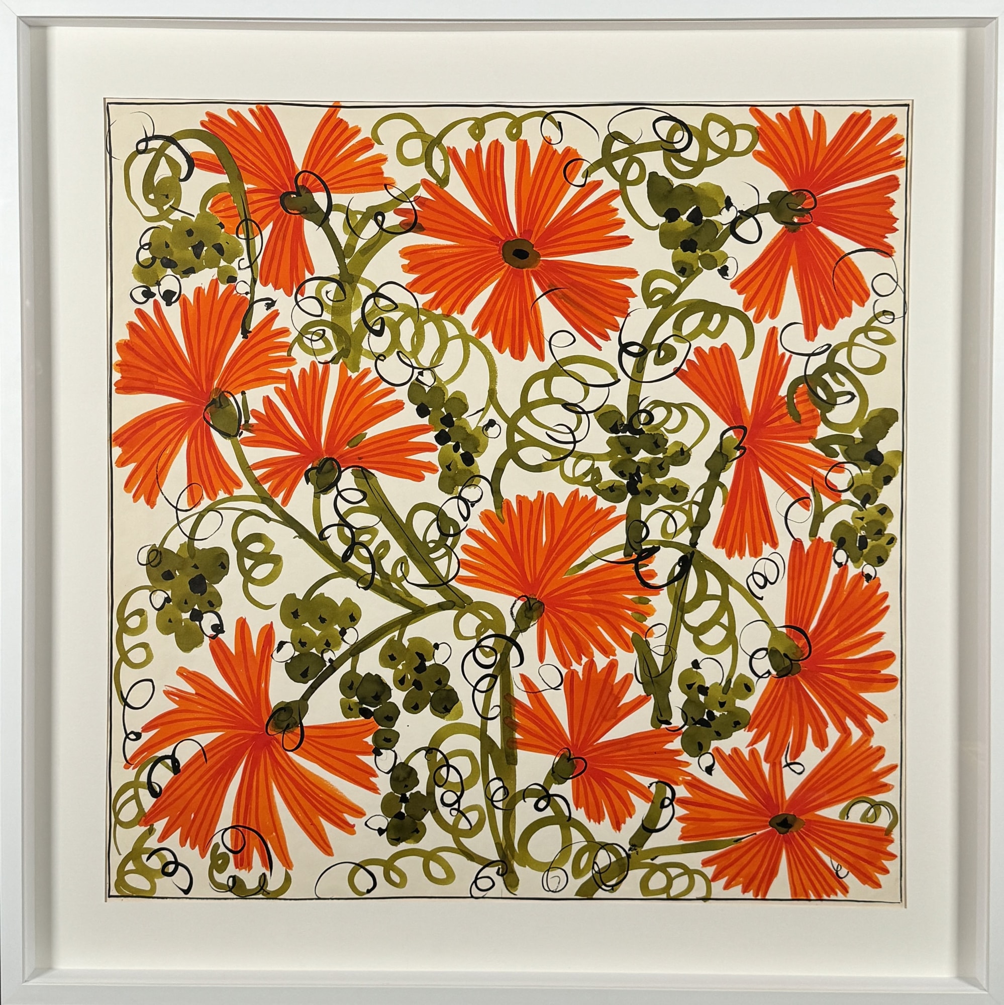 A lively burst of orange blooms dominates this vibrant composition, each flower radiating with bold, linear petals surrounding dark centers. Intertwined among the flowers are playful green tendrils and clusters of small, olive-hued buds, creating a dynamic contrast and sense of movement. The swirling vines add a whimsical touch, weaving through the vivid blossoms with effortless grace. This energetic artwork captures the exuberance of a wild garden, perfect for infusing any space with a touch of mid-century flair and lively charm.