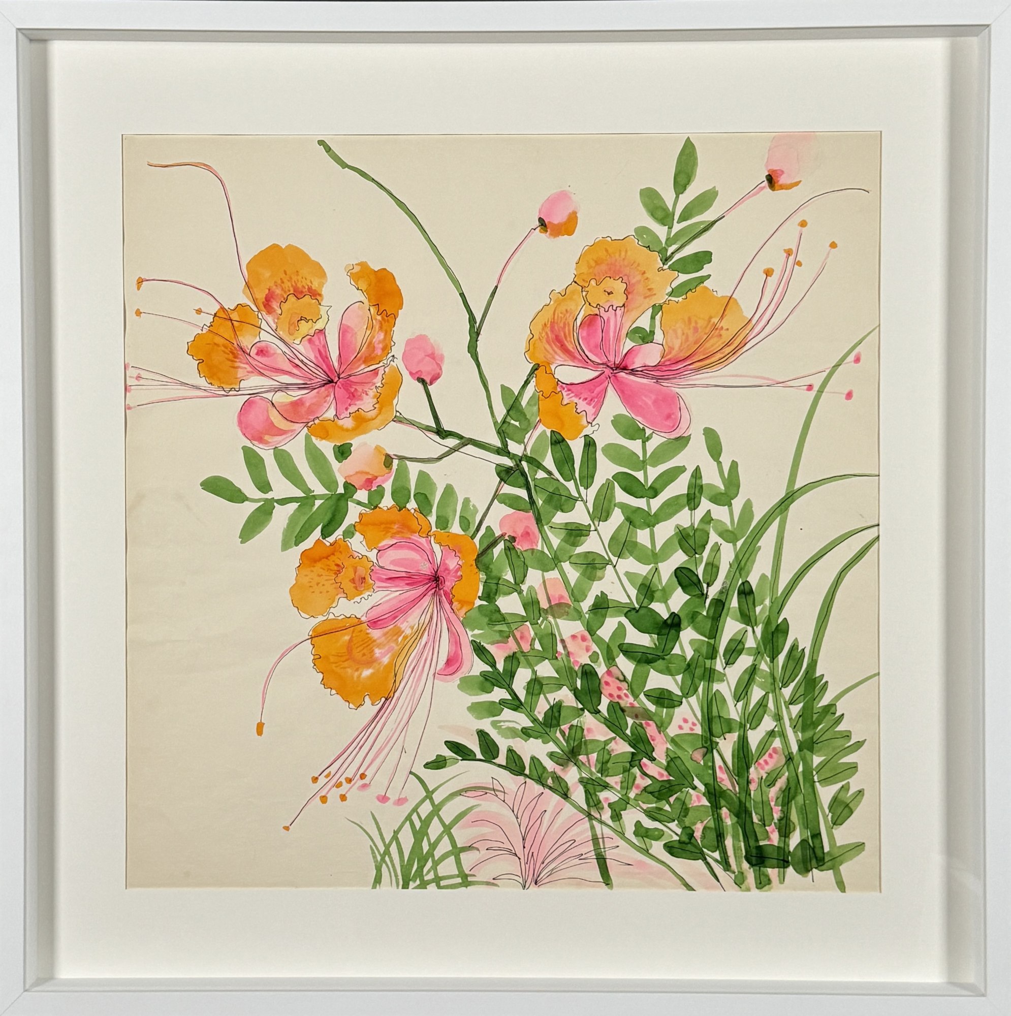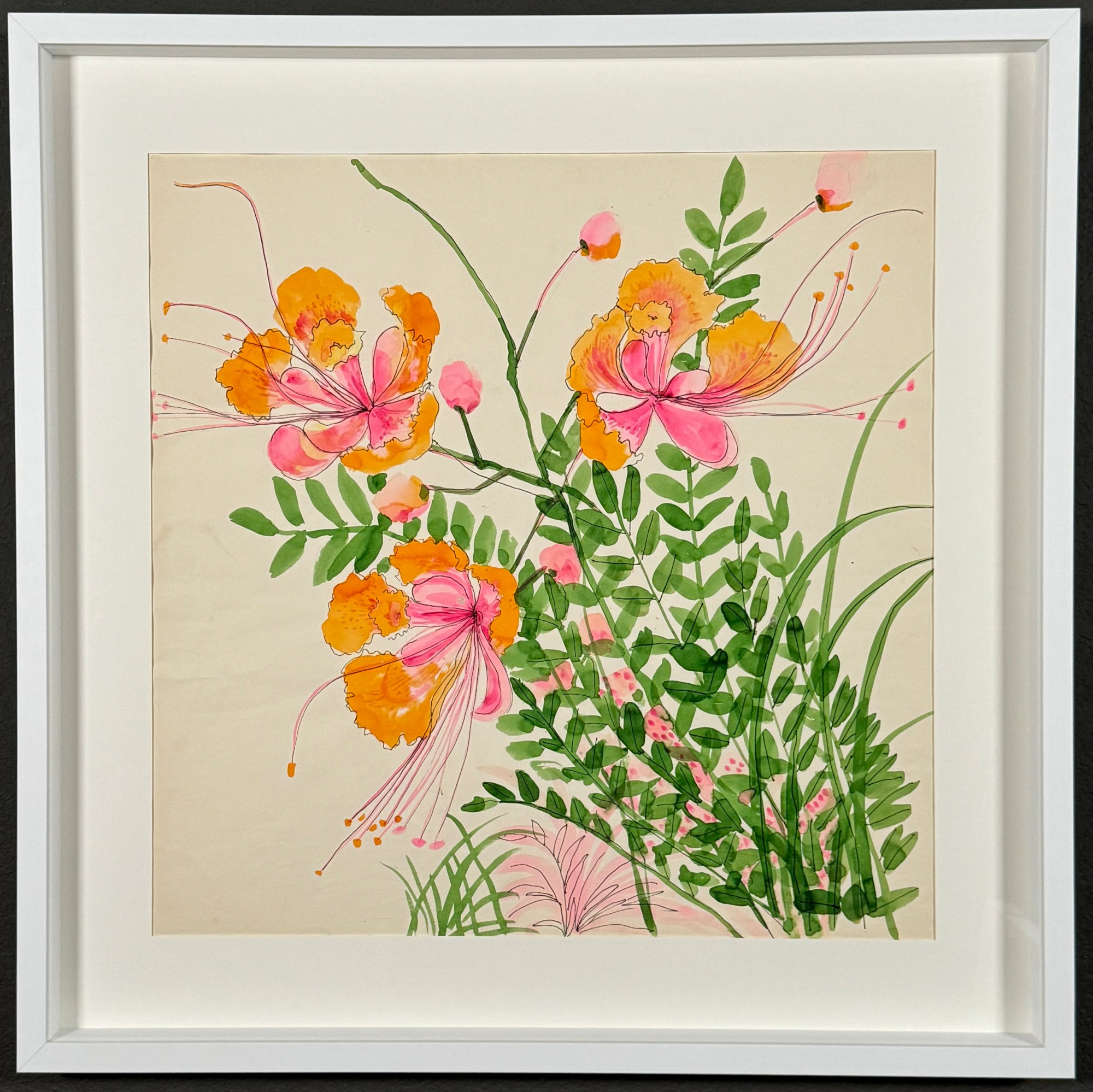 Radiant blooms of tangerine and fuchsia spring to life amidst a verdant sea of foliage. Each petal, delicately tinted and artfully arranged, radiates a lively energy. The intricate green leaves provide a lush backdrop, enhancing the vibrant hues of the flowers. This delightful composition captures the essence of a flourishing garden, imbuing any room with a touch of natural elegance and mid-century sophistication.