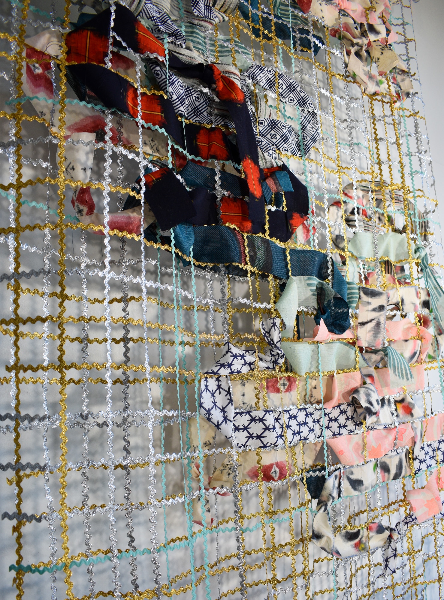 MessageTara Tamaribuchi connects current issues of xenophobia with the history of incarcerated Japanese Americans weaving thousands of camouflage nets for the US Army in World War II. Tamaribuchi weaves strips of kimono fabric to send pride of heritage back in time to her elders onto ric rac to celebrate the midcentury aesthetics of that generation. As camouflage works as a visual blender, the artist rereads this war technology to be a filter through which we see all people as interconnected.