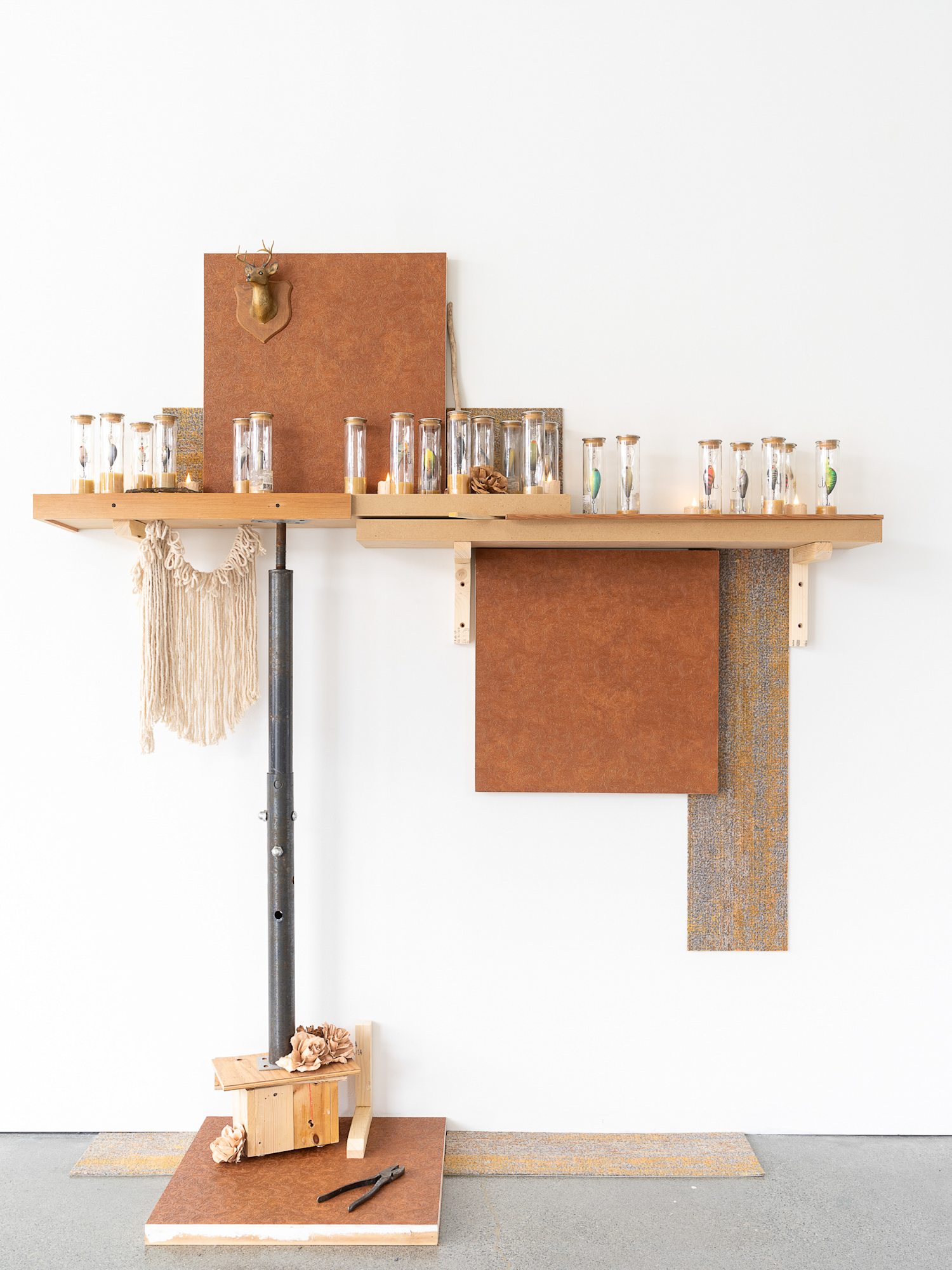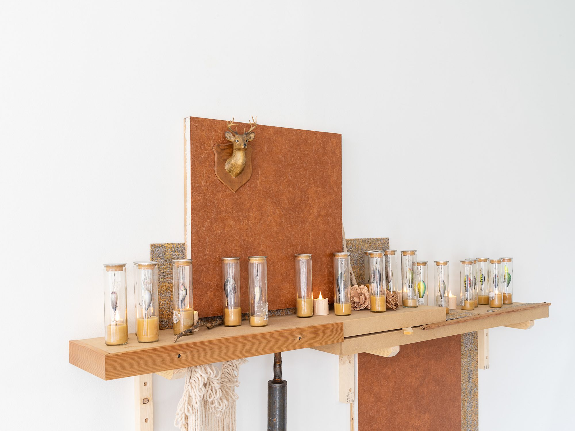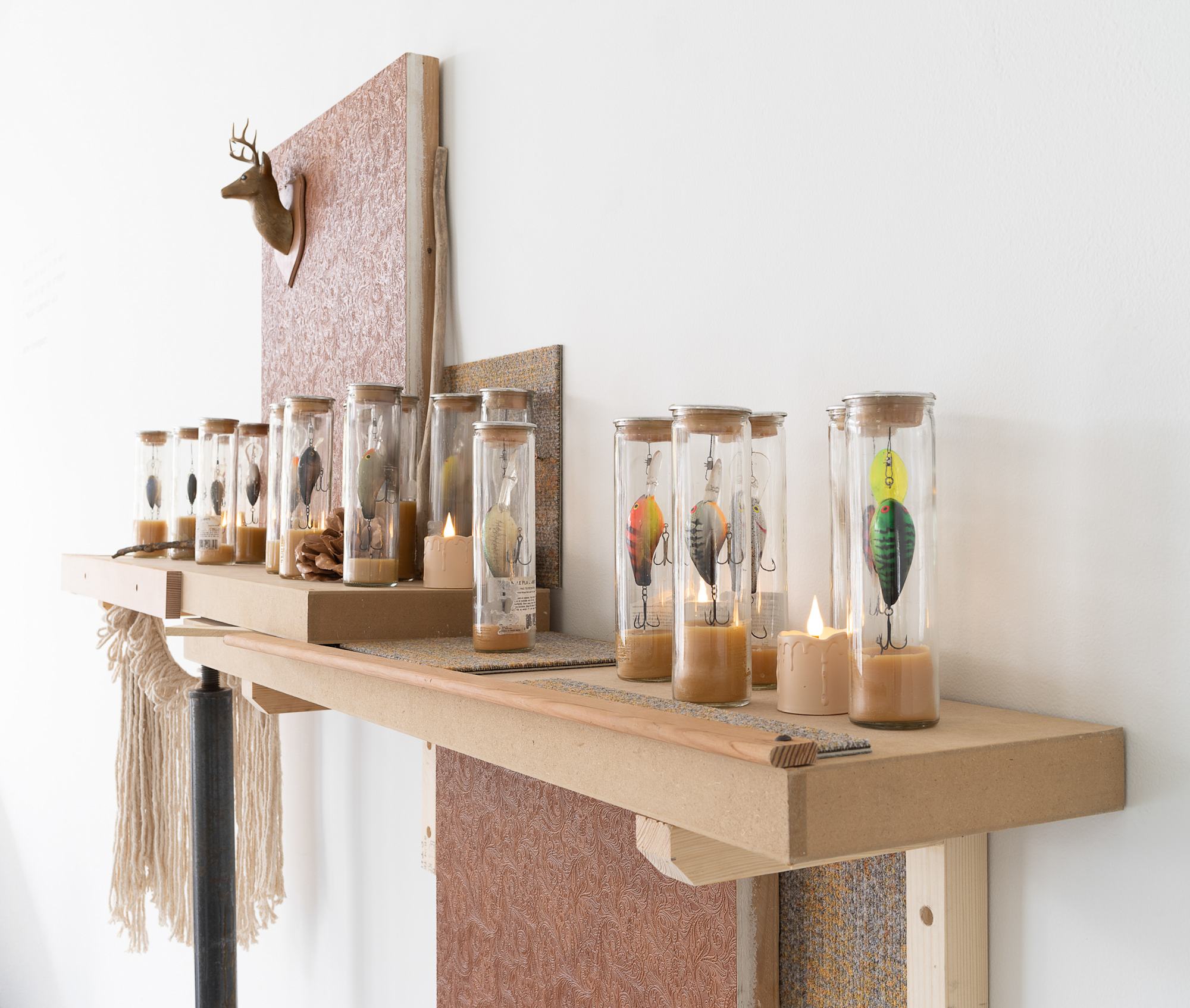 - ” Reclaimed found objects, local bees wax, hand painted faux floral, wood, and imitation tooled leather. All items reclaimed and reused.