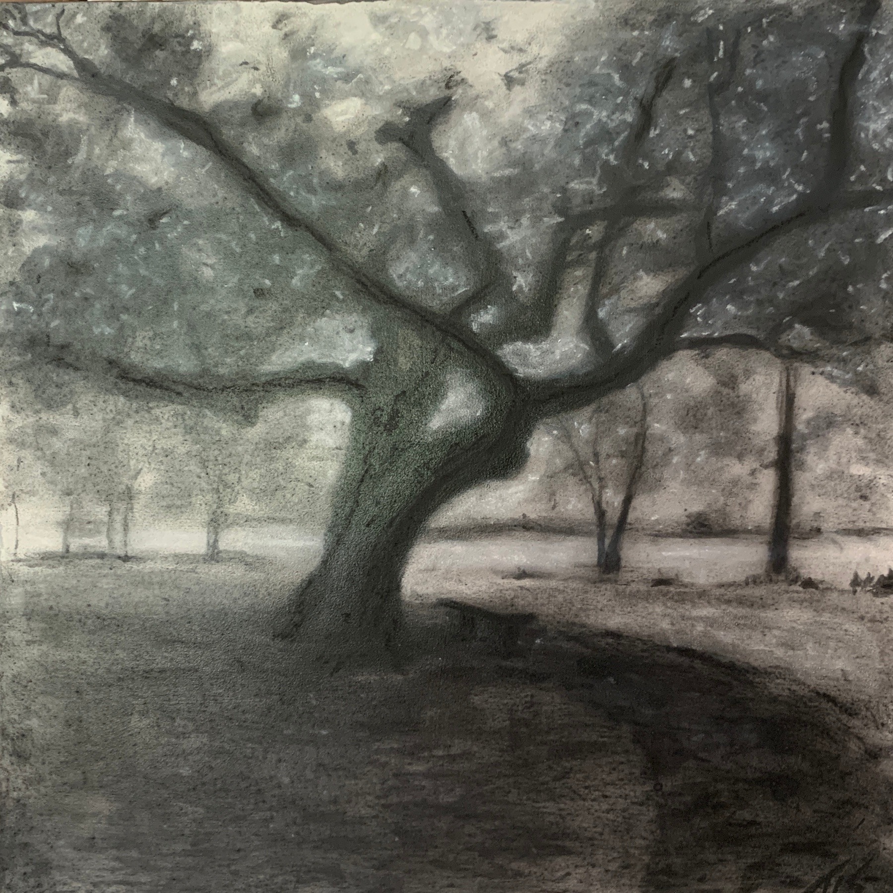 MessagePoet's Walk is a lovely and beloved one mile trail around Ayr Mount and along the Eno River just outside of Hillsborough, NC. The old tree in this rendering is located near the pond.