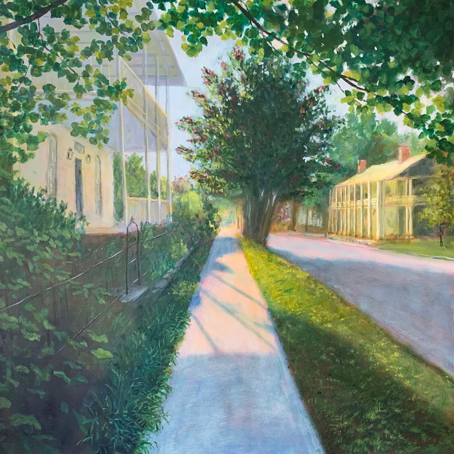MessageThe walkways along Tryon, Wake, and King Streets include some of the most scenic and pleasant places in Hillsborough's Historic District, where this artist has the good fortune to travel daily. This view includes two historic properties, Twin Chimneys and the Colonial Inn.