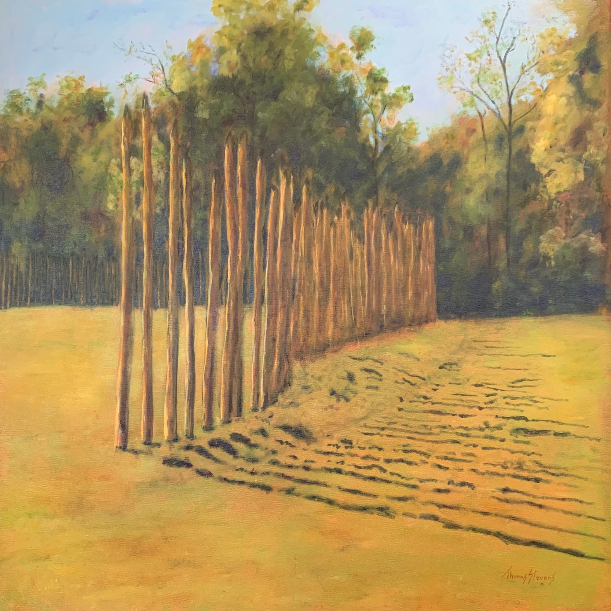 MessageIn the late 1990s a replica Occaneechi village was constructed in Hillsborough along the Eno River, modeled on an original c.1700 village that stood nearby. The replica village became a much visited attraction, and a place for pow-wows and living history events. When the Occaneechi gained tribal status in 2002, the replica village was moved to their nascent cultural center in Alamance County, leaving only a sample of the aging cedar palisade behind. The shadows falling from this line of posts that caught the artist’s eye, inspiring a series of paintings and drawings.