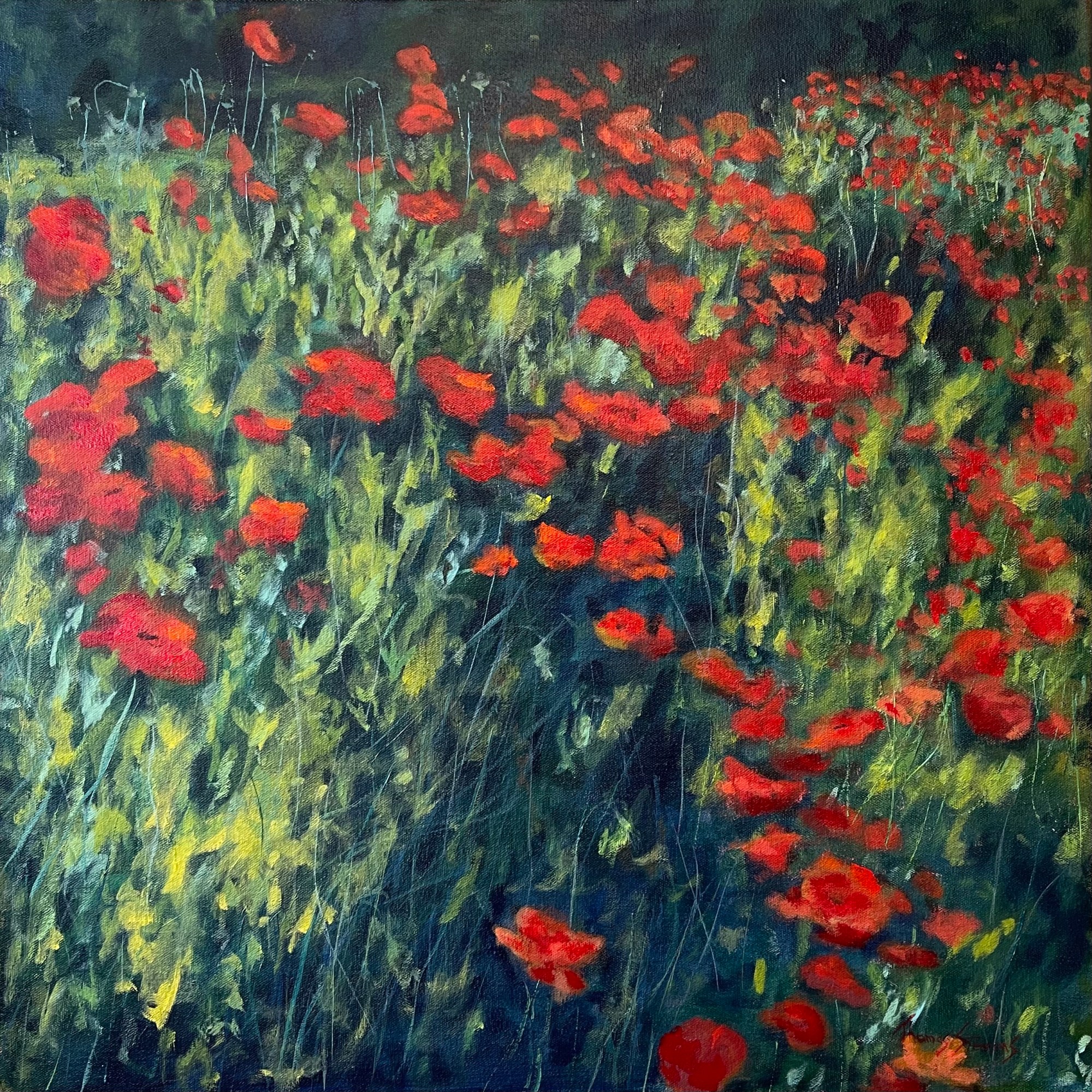 MessageOne of multiple paintings of this subject; A cascade of poppies tumbling over the wall in front of the historic Masonic Lodge - one of several Hillsborough locations where poppies were planted by the Hillsborough Garden Club in commemoration of the 100th anniversary of World War I. The annual return of these poppies is much celebrated, especially by local folks who pass by this spot on King Street, just two doors away from the Thomas Stevens Gallery.
