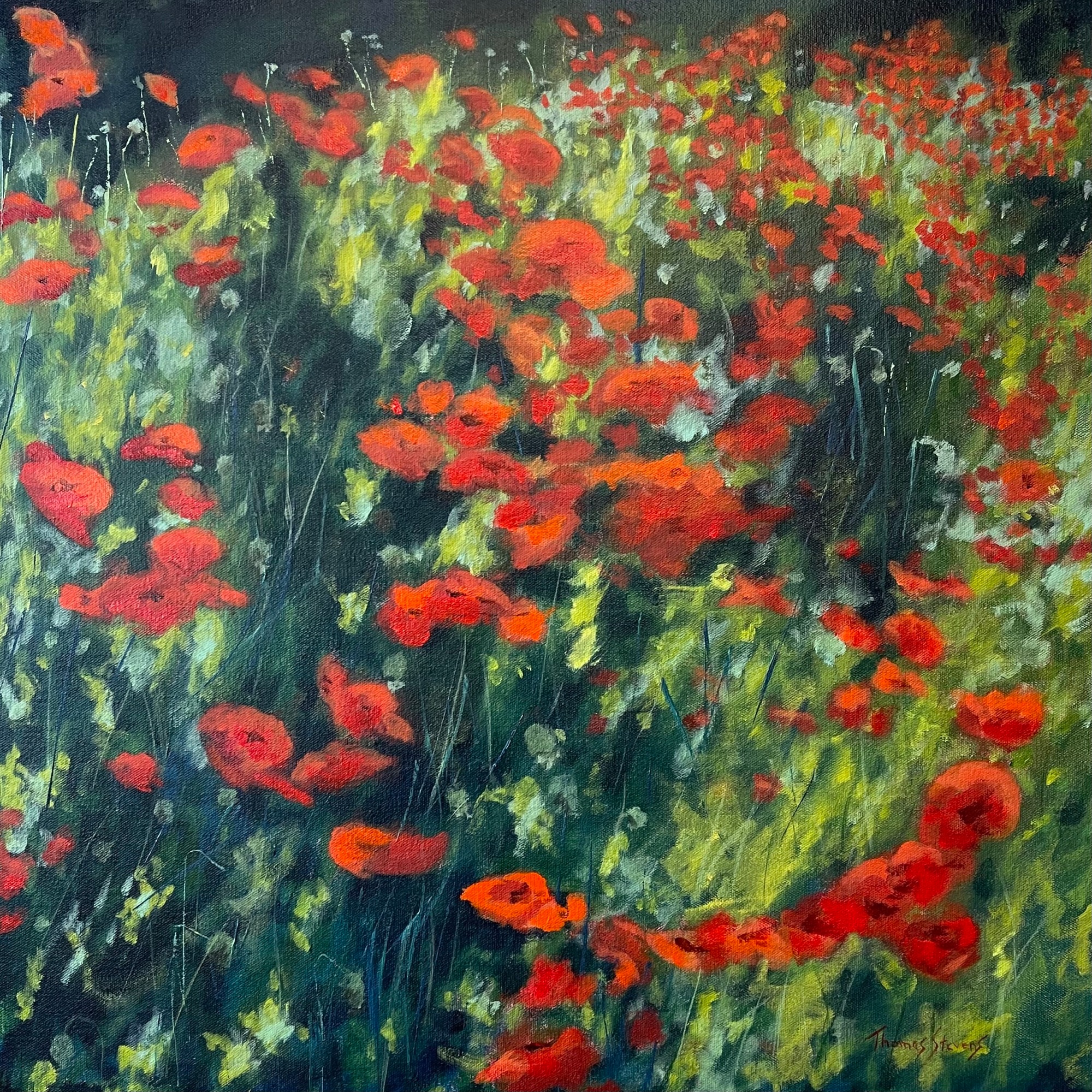 MessageOne of multiple paintings of this subject; A cascade of poppies tumbling over the wall in front of the historic Masonic Lodge - one of several Hillsborough locations where poppies were planted by the Hillsborough Garden Club in commemoration of the 100th anniversary of World War I. The annual return of these poppies is much celebrated, especially by local folks who pass by this spot on King Street, just two doors away from the Thomas Stevens Gallery.