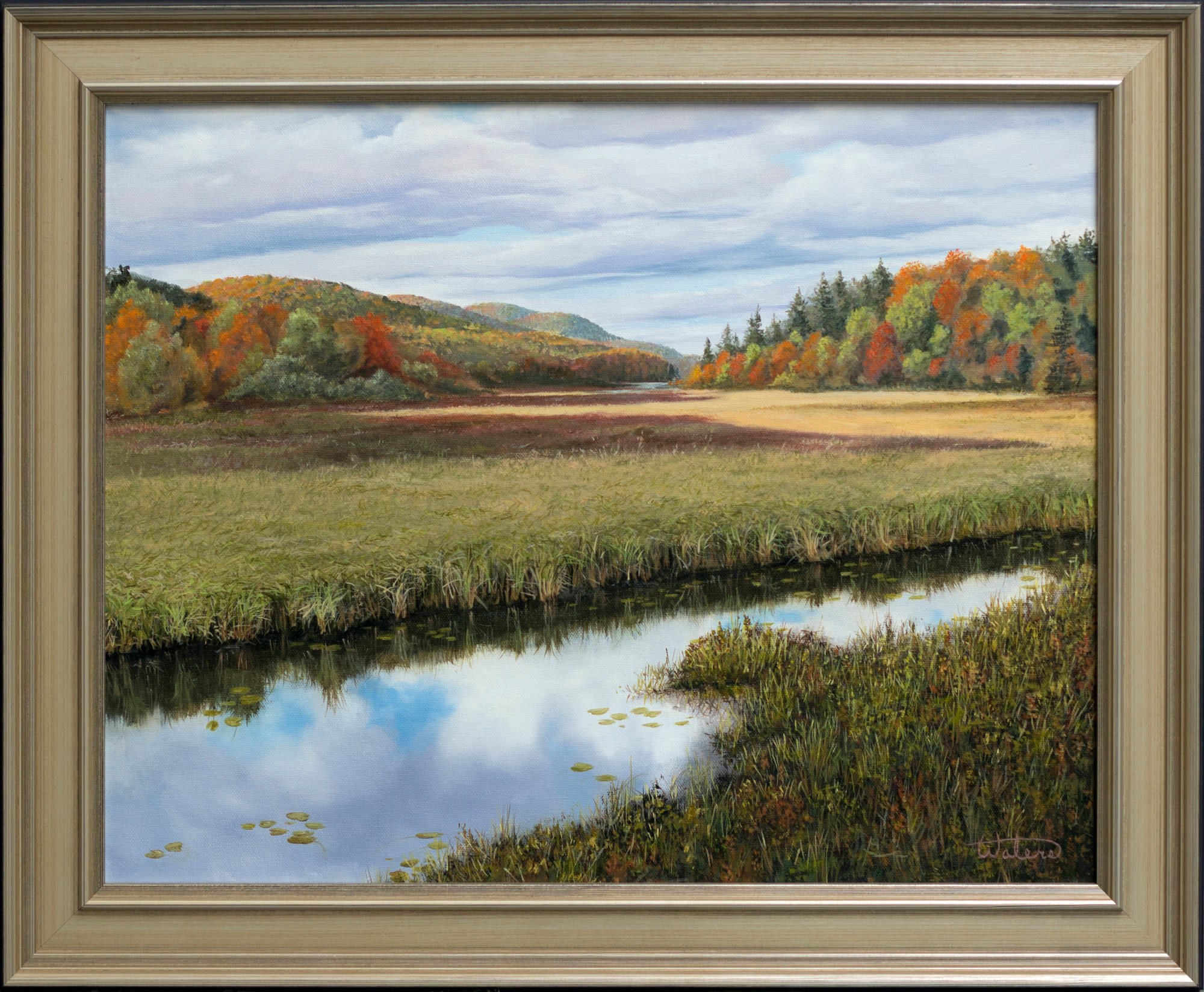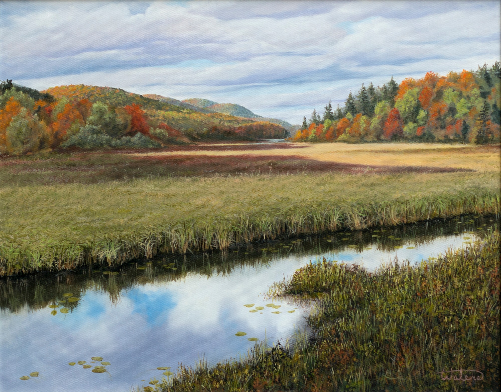 Another painting in a series of paintings inspired by my drive along route 15 between Essex and Jeffersonville Vermont. This particular spot had me stopping several times over the course of a few weeks waiting for the right light conditions. I enjoyed how the light reflected off the calm water on this particular day, and the play of autumn colors both in the marsh grasses and brush, and the distant hills.
